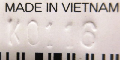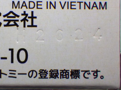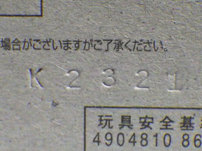 | 【参考画像】 製造年月日の刻印部分の画像。初回特別仕様は同じ所から購入したので刻印も同じになりそうなものだが、実際には画像のように異なっている。同じラインの中にも刻印機が複数並んでセットされているのであろう。 ※アルファベットは製造月を表し、A、B、Cは1月、2月、3月、Kは11月となる。4桁の数字は上2桁が製造日、下2桁が製造年の西暦の下2桁を表す。 |