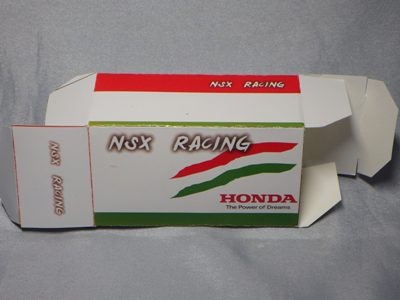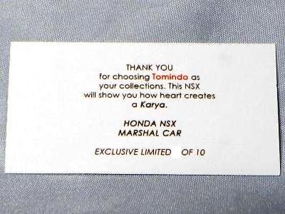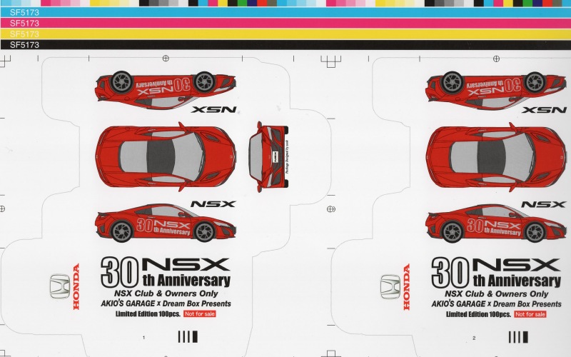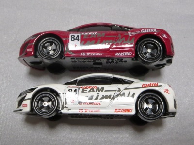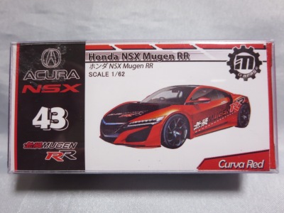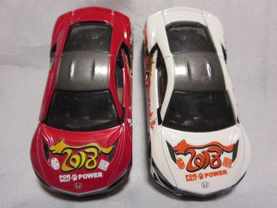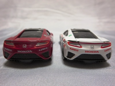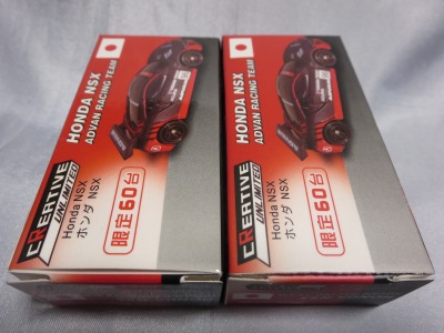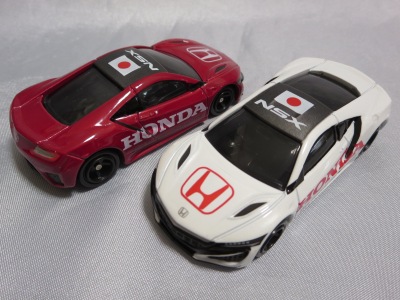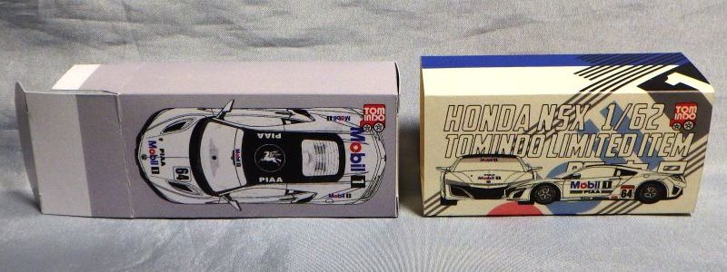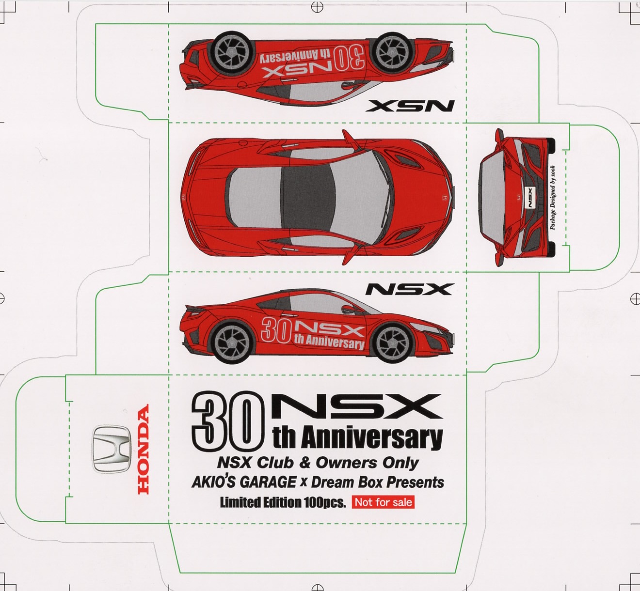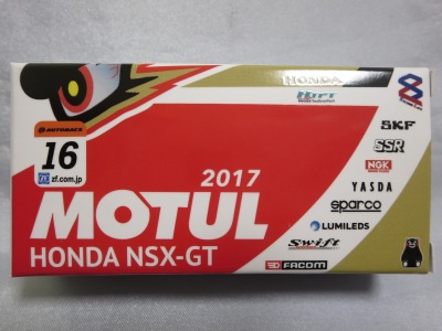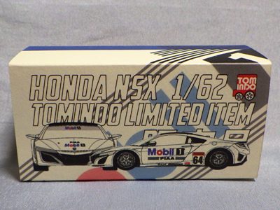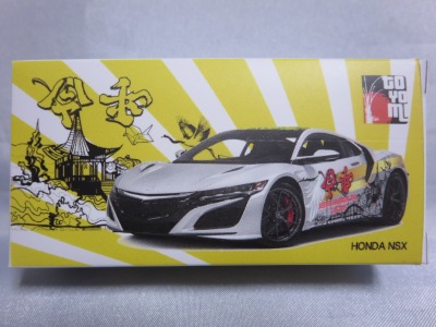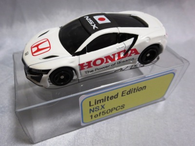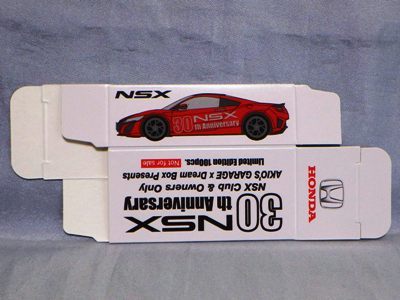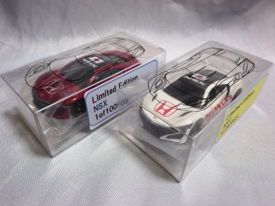 | 2017年3月29日発売。3月29日に東京のショップ・ドリームボックスから発売案内があり早速注文、4月1日に届く。企画したのは中部地域のショップとのこと。初回カラー(白)は50個限定、通常カラー(赤)は100個限定で、注文可能数は、白が1個まで、赤は2個までとなっていた。ルーフにNSXロゴと日本国旗、ボンネットにホンダマーク、両ドアにHONDAロゴのタンポが入る。 付属のクリアケースには、上面にシルエットが線画で描かれ、側面に限定台数を記載したシールが貼付されている。 |