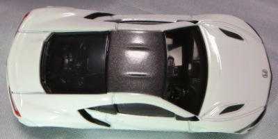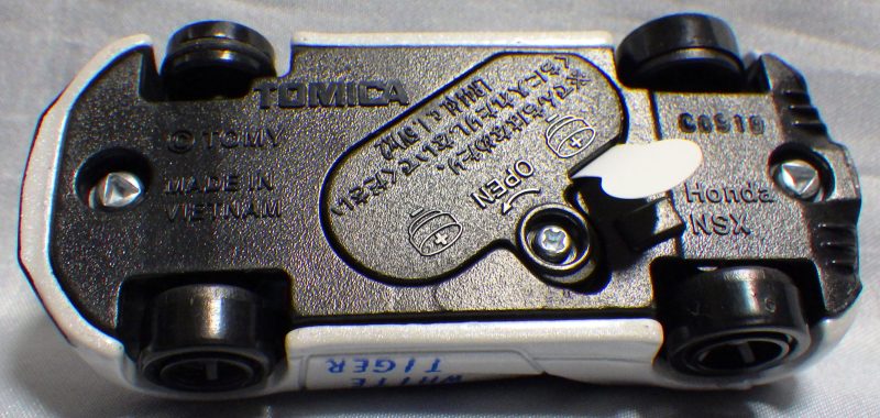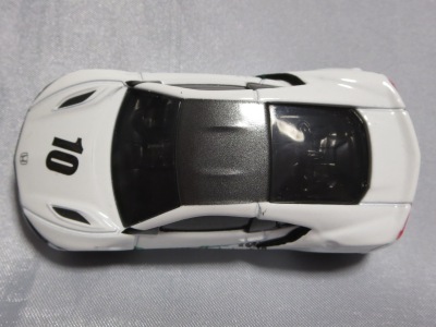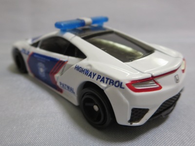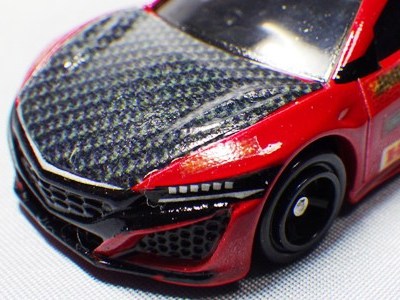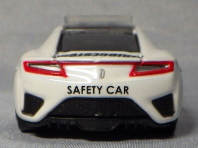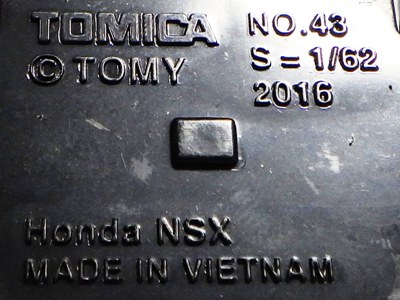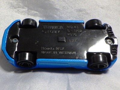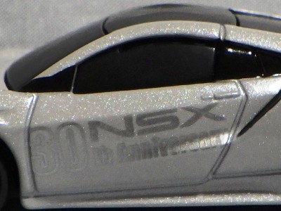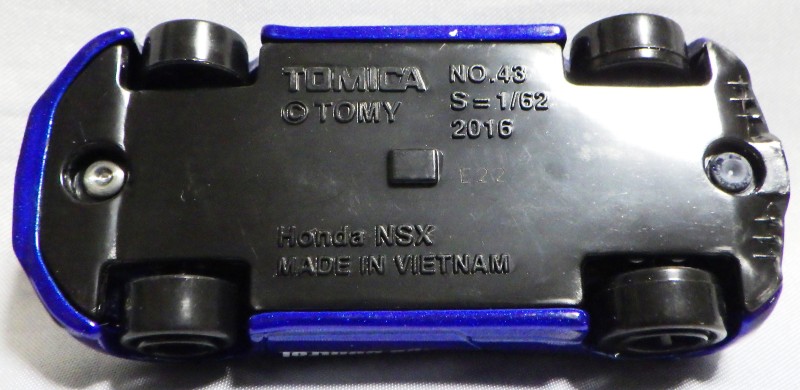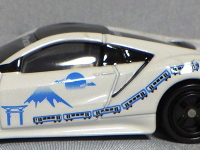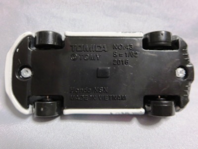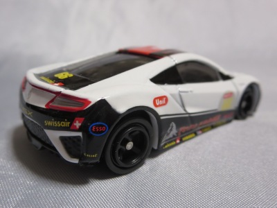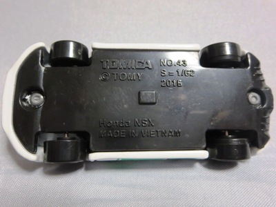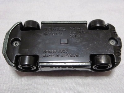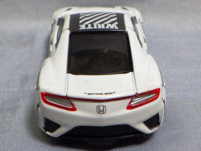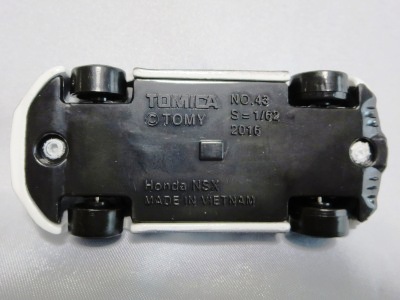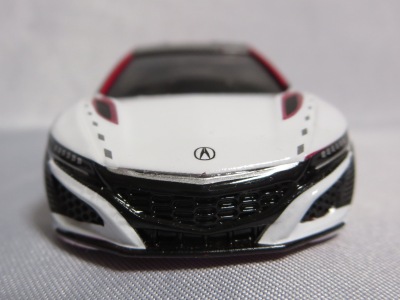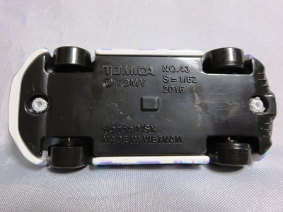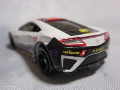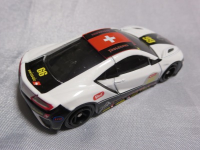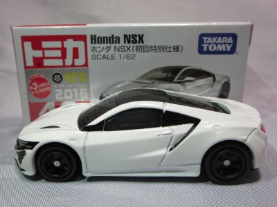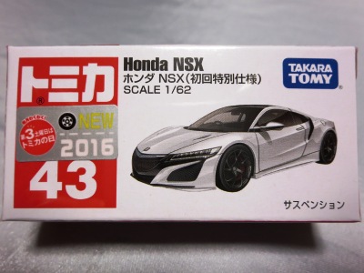 2016年12月17日発売。NSXトミカとしては初の初回特別仕様で、通常品のレッドと共に発売となったが、発売の1か月半ほど前に発売が告知されると一瞬で各ショップの通販サイトは品切れになり、amazonでも2,000円以上のプレ値での販売が始まった。業者と思われるヤフオクへの発売前の出品が続き、5台セット、10台セットが、やがて20台セット、50台セットへとエスカレートして、発売日当日にはメーカー出荷用の元箱入り72台セットが登場した(111,111円と80,000円で岐阜の業者による出品)。 プロポーションは絶妙なディフォルメで破綻はなく、アングルによっては1/43のミニカーではないかと思えるくらいの見事な出来映え。サイドのエッジもキレイに出ていて、リアディフューザーの再現など細かい点もぬかりなし。ただ、初代NSXと異なりクリアパーツはテールライト等には使われず、キャノピーのみの使用となっている。実際のスケールは、初代NSXのトミカでは1/59だったが、新型は実車がサイズアップしたため1/62となった。 ボックスアートはちょっと地味めだが、新商品シールは昔よりも派手になっている。長い間トミカを買ったことがなかったので、全ての箱が薄いセロハンでラッピングされていることに驚いた。箱の裏面の刻印は「K0516」となっており、2016年11月5日製造であることが分かる。ベトナム製。 |