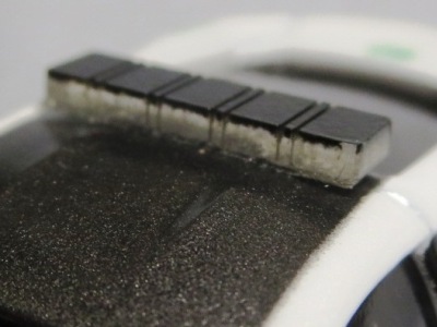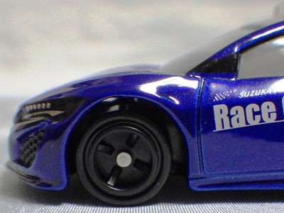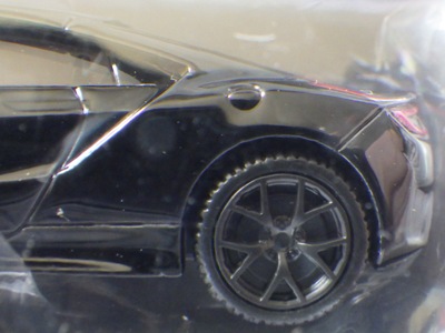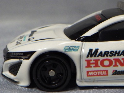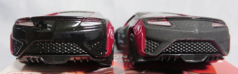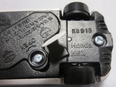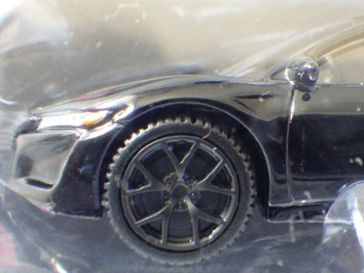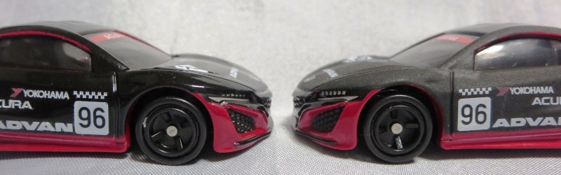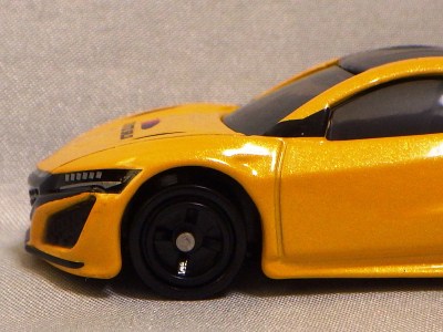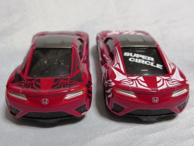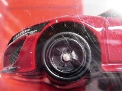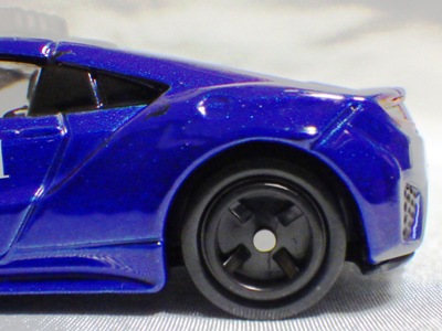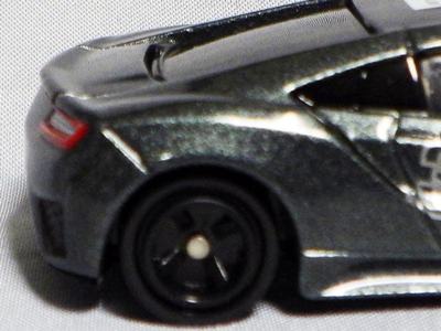 | 初代NSXは発売時に前後異型サイズのホイールを採用していたが(前15インチ/後16インチ、最終的には前後とも17インチとなった)、トミカではそれを再現せず、同サイズの2Gホイールを採用していた。 しかし、新型NSXの前後異型サイズ(前19インチ/後20インチ)は、43トミカで再現されている。フロントには2Gホイールと同サイズの直径約10.5mmの11HNホイールを装着し、リアにはそれより大型の直径約11.5mmの12KNホイールを装着しているのである。 ところが、2018年12月に神奈川のコレクターの方から、前後共に12KNホイールを装着したエラー品があるという情報を頂き、現物も安価で譲っていただいた。 |