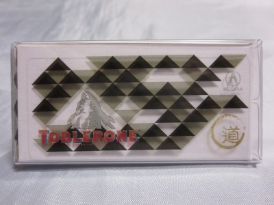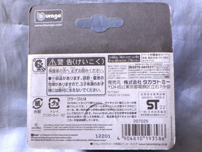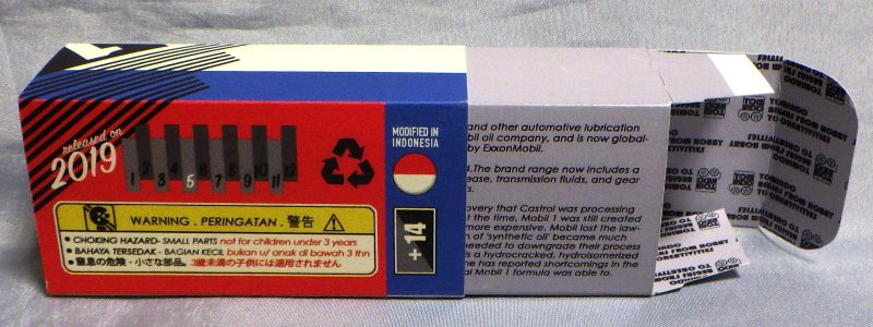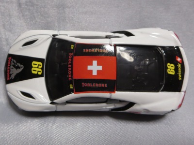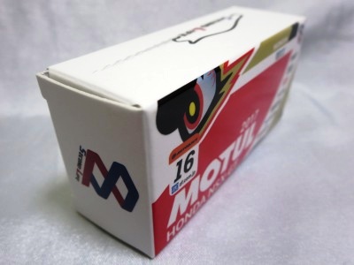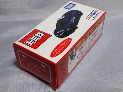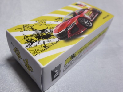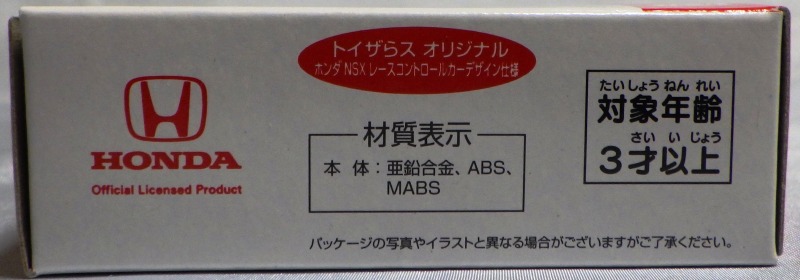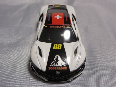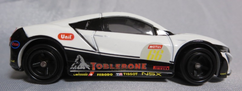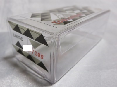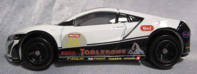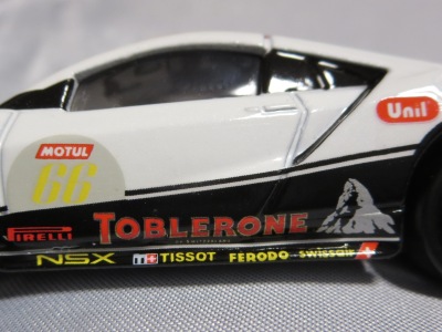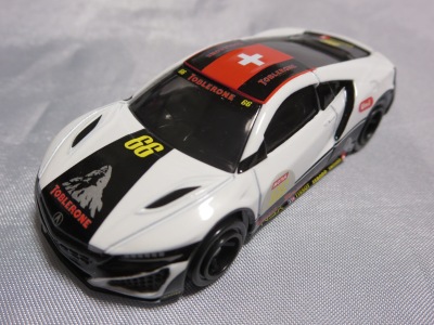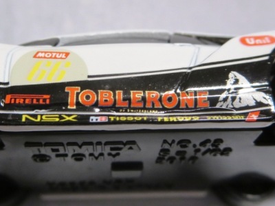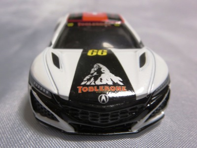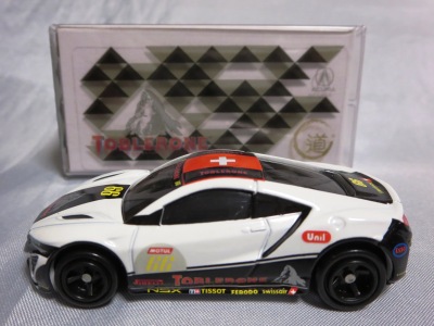 2018年2月1日にヤフオクに初登場した新型NSXの2次加工トミカ「TOBLERONE(トブラローネ)」を7月に入手。「TOBLERONE」はスイスのチョコレートバーブランド。現在この会社はモータースポーツのスポンサードは一切行っておらず、このモデルは架空のマシンということであり、このデザインは制作者の趣味と思われる。 ちなみに山のデザインはマッターホルンで、通常はイエローで描かれており、その中の白抜きされた部分をよく見ると白熊の形になっている。 最近の例に漏れずパッケージも含めハイクオリティ。 108台の限定品でクリアケースにシリアルナンバーが入る。 クリアケースの中の箱は、ただの白箱である。 |