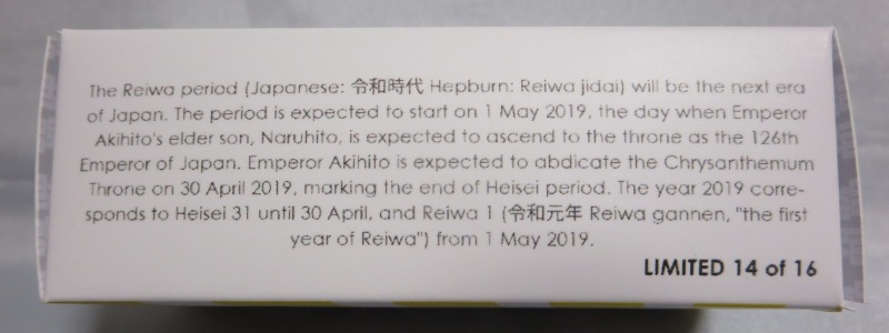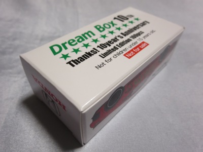 2019年4月に懇意にしているショップの方から、この初回特別仕様の1ダース(12個)入り大箱の空き箱を頂いたので、コレクションに加えることに。普通は捨ててしまうものなので貴重。赤文字で「初回特別仕様」とプリントされている。 下の参考画像にあるように、さらに大きな3ダース収納の大箱も存在するが、こちらは未入手。 |
