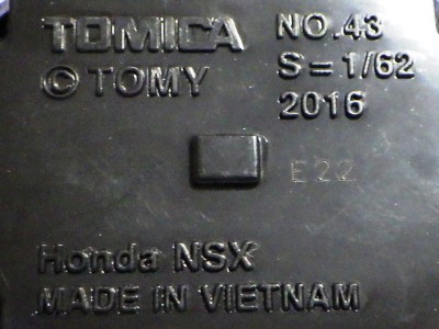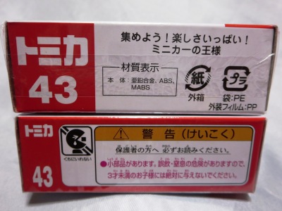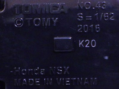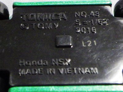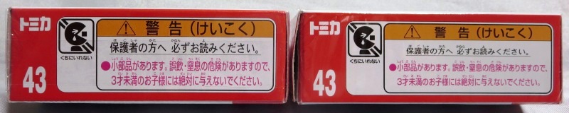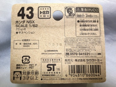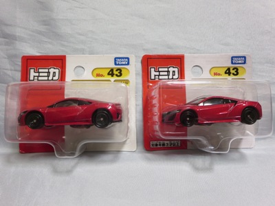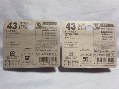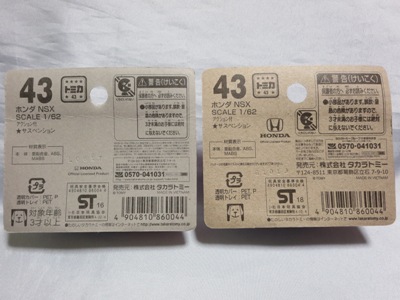 2021年12月24日に富山のトイザで購入。 これまで存在を確認しているブリスターパック43NSXトミカの製造年月日バリエーションは、K0516、G2217、J1617、L0517、B0718、G0419、G1019、H0119、D0820の9種(G0419とH0119はコレクターの方からの情報のみで未入手)であったが、今回発見したのは、F0521(2021年6月5日製造)、K2321(2021年11月23日製造)という初めて見る2021年製造モデル。 パッケージデザインは両面とも同じだが、紙質は画像の通り、かなり異なっている。 裏板の刻印は、それぞれF21、K21で、パッケージの刻印と一致。 ちなみにD0820も一緒に販売されていた。 価格は税込349円だった。 2022年8月13日に地元のトイザを訪れたときはK2321のみが販売されていた。 |