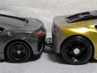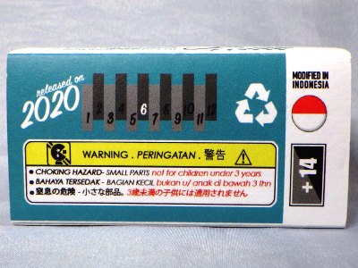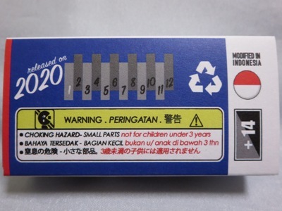 2020年12月24日に地元のトイザらスにて購入。 2020年12月2日に訪れたときには1年前と同じく「G1019」(2019年7月19日製造)が販売されていたが、クリスマス商戦でやっと新しいものに入れ替わった模様。 ミニカー本体にもパッケージデザインにも変更はないが、パッケージの紙質は質の悪そうな茶系からグレーっぽい良さそうなものにものに改善されている。 並んでいる画像は左がD0820、右がG1019。 また、裏板にHWと同じような製造年月を示すと思われる刻印が入るようになった(D0820が2020年4月8日製造を表すので、D20は2020年4月製造を表すと思われる)。 2個購入したが、下の画像のように刻印の場所はほぼ同じで、位置がバラバラのHWとは異なる。 |