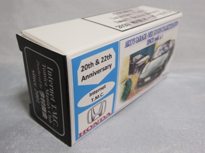 | 2017年12月21日にヤフオクに初登場(静岡県からの出品)。ビクトリーは、静岡県浜松市のホビーショップで、ネットで調べると共通のロゴ入りのクリアケースに入ったスペシャルモデルなるものが複数存在している。 2012年のフェアレディZ(赤)、2015年のトヨタ86(赤&青)、2016年のトヨタ86(青)、年度の入っていないS660(白)のほか、カラーは不明だがシビックタイプRもあるようだ。さらにはイグニッションモデル (1/43)にまでセリカ1600GTV(紫)といった特注品がある。 トランクに「ACURA」の文字、ルーフと両ドアに「5」のゼッケン、両ドアには「VICTORY」の店名もタンポ印刷される。ボンネットがつや消しブラックで塗装され、うっすらとホンダエンブレムが見えるのが渋い。 専用のクリアケース入りで紙箱はない。 |