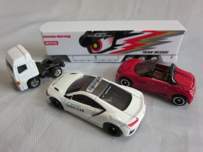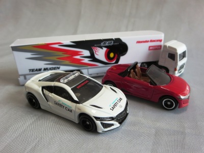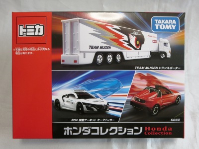 | 2018年3月17日発売。 チーム無限トランスポーターとNSX鈴鹿サーキットセーフティカーと特別カラーのレッドのS660(通常品はホワイトで初回限定カラーはイエローだった)の3点セット。 残念ながらトランスポーターは通常のトミカを搭載できるサイズではない。 2018年3月10日、11日の2日間、鈴鹿サーキットで開催されたモータースポーツファン感謝デーのトミカブースで500セットが先行販売され、すぐにヤフオクに出品されていた。 その前から予約済み商品という名目でヤフオクにプレ値で出品され入札も入っていたが、Amazonでは取り扱いを開始した1月30日から発売日まで品切れになることなく、ずっと注文可能だった。予約販売価格は1,763円、発売直後の価格は2,149円であった。 |
