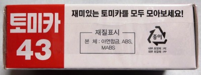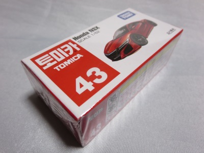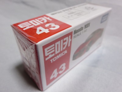 ヤフオクに2018年9月1日に初登場したものを入手。 タカラトミーは、2010年7月から欧米20か国でトミカの販売を開始。2011年7月から中国でもトミカの販売を開始した。その後、韓国、台湾、その他アジア諸国でも販売開始。 韓国では、タカラトミーの系列会社と思われるT-ARTS KOREAが販売しており、その公式サイトを見ると、日本のトミカのラインナップがほぼ全て日本と同じ番号で販売されていることが分かる。 それに加え韓国専売となるKR-01ヒュンダイ・ソナタ、KR-02ヒュンダイ・ヴェロスターターボなども販売されてい る(中国専売品にはCN-、その他アジア諸国の専売品にはAN-の記号が付 く)。ちなみにこのソナタは、2013年6月15日から日本のショッピングサイト「タカラトミーモール」で海外トミカシリーズ第1弾として販売された(525円)。 43NSXの日本での発売は2016年12月だが、いつごろ韓国トミカのラインナップに加わったのか不明 。公式サイトでの製造年月は2018年3月となっているが、現在販売されている最新ロットの製造年月という意味で あろう。入手品のパッケージの刻印は「C2318」なの で2018年3月23日製造の商品ということになる。 中身のトミカについては、国内販売品と全く違いがないらしいので、あえて未開封のまま保管する。 定価は現地で4,900ウォンとのことで、2018年9月11日現在のレートでは日本円にして約480円となる。 |