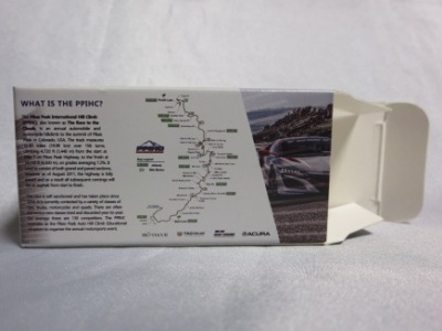 ヤフオクに2018年6月12日に初登場。香港からの入手。 この仕様のミニカーは、2016年8月29日にTSMが999台限定で発売した1/18のみで、そのTSMモデルも人気がなかったが、このトミカも初登場ながらほとんど注目されず、3,900円スタートでライバル1名相手にちょっとだけ戦って4,100円で落札できた。 初回限定カラーのホワイトベースかと思いきや、通常品のレッドベース。 この車は、2015年6月28日に開催されたPPIHC(Pikes Peak International Hillclimb=パイクスピーク・インターナショナル・ヒルクライム)決勝レースで、公式ペースカーとして標高約4,300mのゴールまで140台の参加車両を先導したマシン。 PPIHCは、アメリカ・コロラド州で毎年アメリカ独立記念日前後に行われる自動車と二輪車のレース。「雲へ向かうレース(The Race to the Clouds)」とも呼ばれている。 オリジナルの紙箱は非常に凝った美しいもの。 |