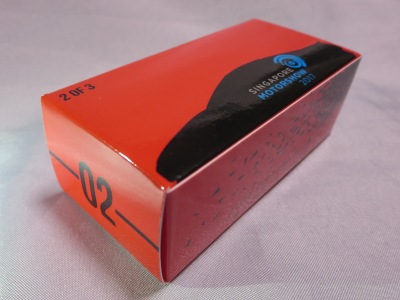 2017年7月19日ヤフオク初登場。7月26日に2度目の出品があった時に落札。出品者は43-4-9でご紹介した静岡のミニカーショップ「ROUTE(ルット)」。オレンジのGT-R(1OF3)、ホワイトのシビックタイプR(3OF3)の3点が一緒にパッケージに収まった画像をネットで見つけ、実際に販売されたオフィシャルな商品であると一度は判断したが、あまりに情報が少なく話題にもなっていないようなので、これも今流行りの特注モデル風海外個人(ショップ?)カスタムのようだ。画像には写っていないが、無地のクリアケースもあり。 ちなみにシンガポールモーターショー2017は、2017年1月13日に、実際に開催されたショーである。