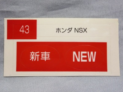 2019年5月に「トミカ43NSX」の新車シールを他のホンダ車4種(シビックType-R、ステップワゴン、S660、N BOX)と共に入手。 一般的にトミカの新車シールと呼ばれているものは、左下の画像のように新車のパッケージに貼られるものだが、この商品は展示ケースなどに貼られる店頭用のもので、市場にはなかなか出回らない。 サイズは3.3×6.5cmで、5.2×8.3cmのビニール袋に1枚ずつ入っている。 シールは、1枚のシートに「43NSX」「新車」「NEW」の3つに分かれて収められている。 ちなみにパッケージ用のシールは毎年のようにデザインが変わり、「ぐーたらみっくん」さんのブログでは、歴代の画像と共に丁寧に紹介されている。 |