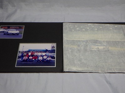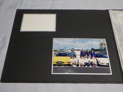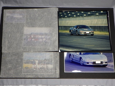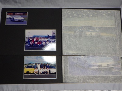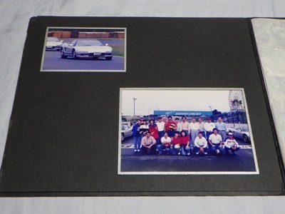 | ▲1冊目の右ページの写真は別のイベントの写真が挟まったもの。実際には左ページの左上と同じ写真が引き伸ばされて収まっている。左ページの集合写真には講師のガンさんこと黒沢元治さんが写っている。一番下の画像が右ページの上に重なっていた別イベントと思われる写真。車両は同じ神戸ナンバーのNSX。 | ▲こちらが2冊目。左ページ左上の写真は、オーナーの方が記念に抜き取ったのか最初からなかった。こちらの集合写真にもガンさんが写っている。右ページのオーナーのお顔は加工している。出品者によれば、この3点の商品はオーナーから譲り受けたものとのこと。 |