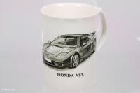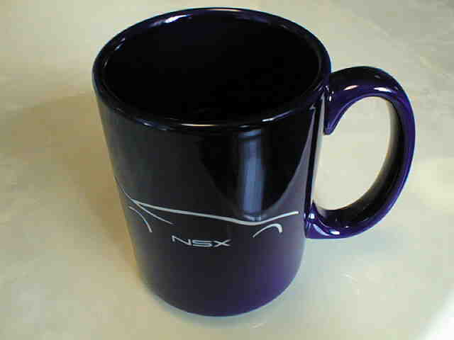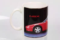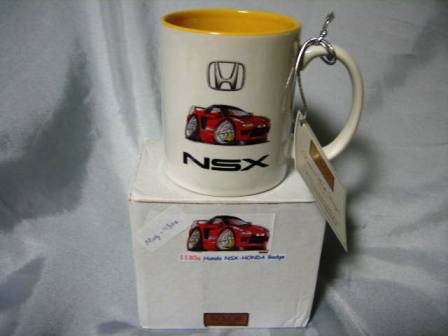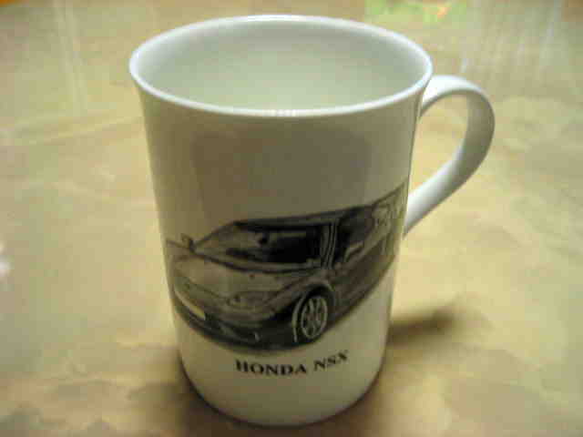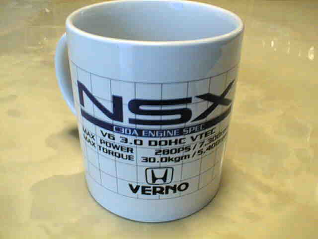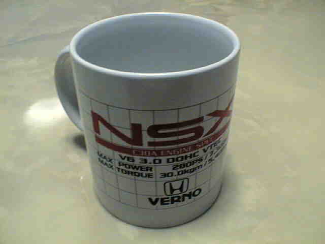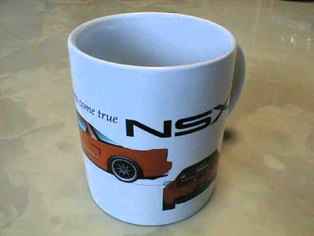 | ヤフオクにて購入。高さ9.5cm、直径8cm。「NSX」ロゴのみのシンプルなカップ。 | ヤフオクにて購入。高さ9.5cm、直径8cm。オレンジボディのNSXの3面図をプリントしている。販促用試作品で実際に配布されていないもの。 | ||