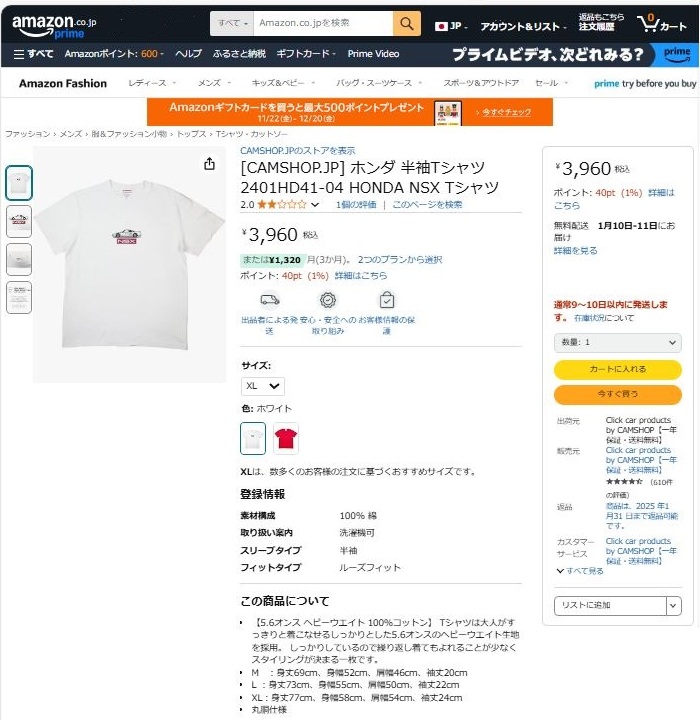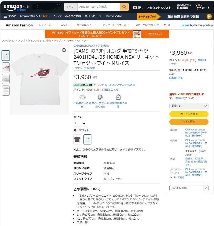 amazonでの取扱開始日はTシャツが2021年9月18日、長袖Tシャツが2021年10月22日となっている。 上記のライジングサンのデザイン商品と同じ価格で、サイス設定も同じ。 共にブラックのLサイズを購入した。