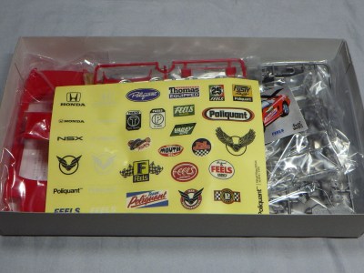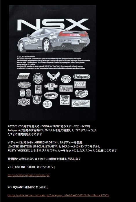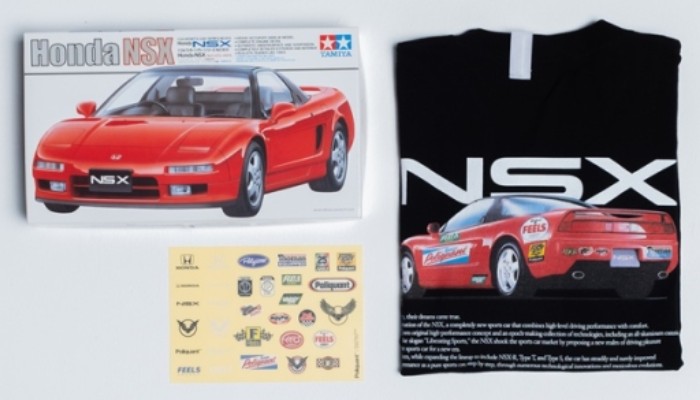 それがPoliquant(ポリクアント)「THE NEW SPORTS X 1990 S/S TEE(ショートスリーブTシャツ) / L/S TEE(ロングスリーブTシャツ)」。 ポリクアントは、2015年にデザイナーの杉田純一氏が立ち上げた日本発のメンズブランドで、90年代ストリートやモード、アウトドアの要素をミックスした「テクニカルストリート」を得意としている。 ポリクアントというブランド名は「polite」と「piquant」を掛け合わせた造語。 ポリクアントがNSXをデザインした限定コラボTシャツを発売したのは、NSXの35周年にあたる2025年5月7日。 「THE NEW SPORTS X 1990」シリーズとして、初代NSXをモチーフにしたこの限定Tシャツは、S/S(半袖・18,700円)とL/S(長袖・22,000円)のバリエーションがあり、なんと、それぞれにタミヤの1/24プラモデルやオリジナルステッカーがセットになった「LIMITED EDITION SPECIAL」(22,550円/25,850円)まで用意されている。 このプラモデルにこのオリジナルステッカーを使用することで、ポリクアントのデモカーを再現できる。 意外にも複数の公式ショップに僅かに在庫はあるものの、価格が価格だけに迷ったが、結局購入してしまった。 さすがに4種全ては購入できないため、とりあえず最高額の商品となる長袖の「LIMITED EDITION SPECIAL」を購入。 届いた段ボールを開けてみると、出てきたのは見慣れたタミヤのプラモデルのパッケージ。 「肝心のロンTはどこ?」と思ったら、このプラモデルのパッケージの中にキレイに収まっていた。