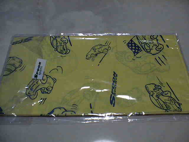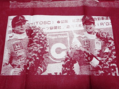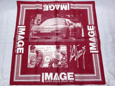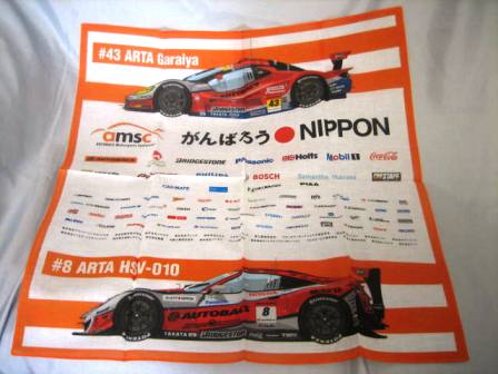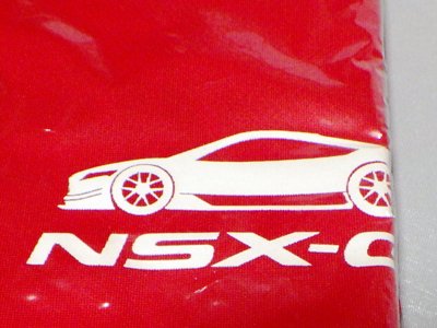 | 2008年6月ヤフオクにてバンダナ、フラッグ、キャップの3点セットで購入したが、NSXがプリントされていたのはバンダナのみ。サイズは51×51cm。 | 2011年7月 、コレクター仲間より譲っていただく。同時期にサーキットで配布された、クリアファイル、ステッカーとはレイアウトなどは異なるが、共通のコンセプトのデザイン。サイズは52×52cm。 | ||