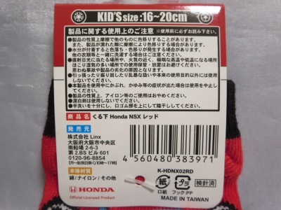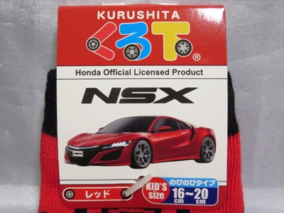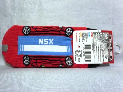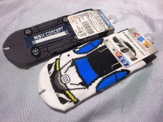 | 2016年1月8日ヤフオク初登場。キッズ用の靴下で、サイズは16〜20cm。NSXコンセプト2013はホワイトとグレーの2種がある。他にGT-R、フェアレディZ、プリウス、クラウンパトカー、アクセラ、ハスラーなどがあり、いずれもメーカーの承認を得ている。 | |||