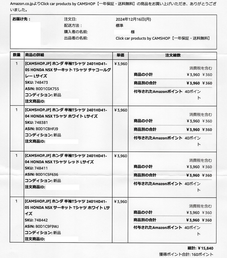amazonでの取扱開始日はいずれも2021年9月18日となっているが、これまでまったく気がつかなかった。 このブランドでは、NSXのほか、スカイライン、シルビア、RX-7などの同じようなデザインの商品が多数ラインナップされており、半袖Tシャツが2,000円、長袖ロングTシャツが2,750円と格安。 NSX以外の車種ではパーカー(4,400円)やジップパーカー(4,600円)もラインナップされている。 半袖Tシャツは15色を用意、サイズも7種あり、さらにメンズとレディースも選択可能だが、長袖のロングTシャツの方はブラックとネイビーの2色のみで、フィットタイプはユニセックス1種のみ、サイズは5種と少なめ。 共にブラックのLサイズを購入した。 紙袋に入って届いた商品は、領収書も紙タグもなくビニール袋にすら入っていなかったが、この価格なら納得。 生地も洗濯にどれだけ耐えられるのかは分からないが、ぱっと見それほど品質が低そうには見えなかった。