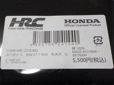 HRC ありがとうNSX-GT Tシャツ ブラックLL/HRC/5,500円