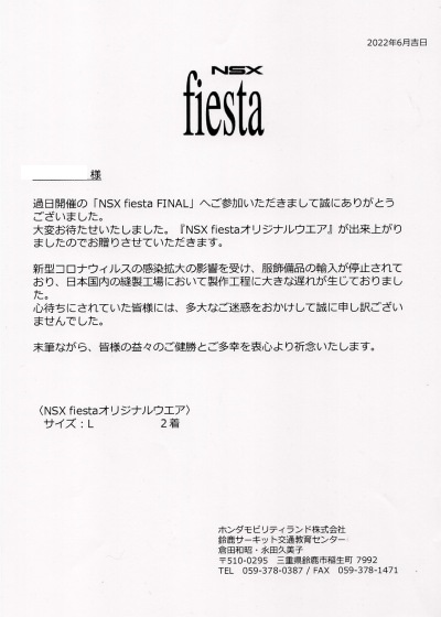 NSXのデビューは1990年で、2年後の1992年から2022年まで31年も続いたホンダ主催のイベントが「NSX fiesta」。 基本的には参加者全員が参加記念ウェアをもらうことができ(同伴者は有料で、参加者も途中から有料になった)、1995年のNSX購入以来、なるべく参加するようにしていた私は、参加した年に頂いたものは大事に保管しているが、1998年に続く2度目の不参加だったのがこの2009年で、記念ウェアはこれまでヤフオク等でも未入手であった。 その後、2012年、2015年、2016年、2018年と計6回欠席したが(2020年と2021年はコロナで中止)、2022年のfinalを含め、計16回も参加したのかと思うとなかなかに感慨深いものがある。
