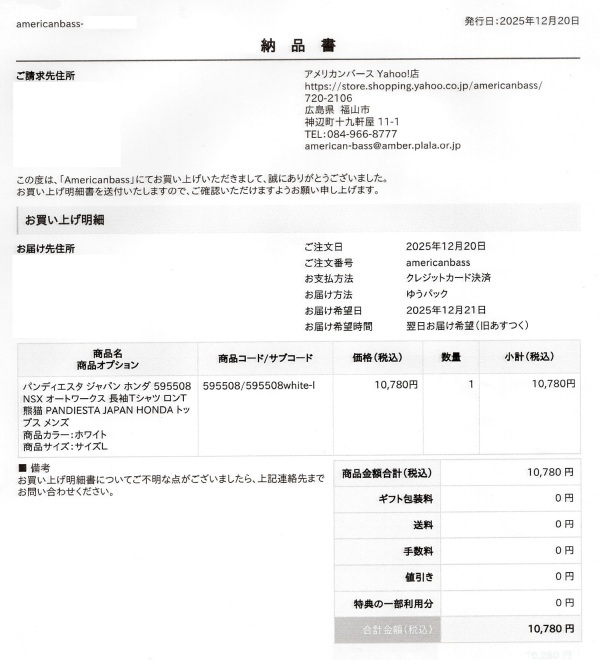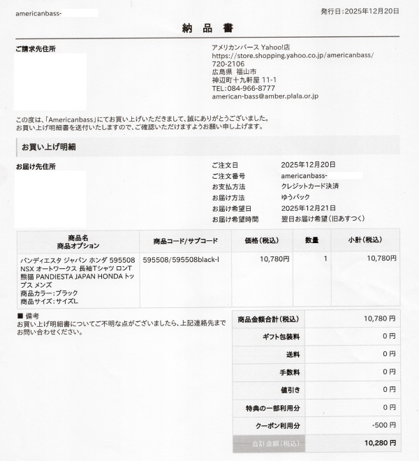 「パンディエスタ(PANDIESTA JAPAN)」は、「株式会社三高(SANNKO)」というアパレル会社が2012年にスタートさせた日本発のファッションブランドで、特にストリート系やミリタリー系のテイストを取り入れたユニークなデザインで人気。 最大の特徴はブランドのアイコンでもある「パンダ」のキャラクターたち。 このパンダたちが、忍者やライダー、パイロットなど、様々なスタイルに扮して登場するのがこのブランドの魅力。 デザインだけではなく、ジャケットやジーンズには精巧な刺繍や立体的なワッペンが施されていて職人技が光っている。 ブランド名は「パンダ(PANDA)」と「サンディエゴ(San Diego)」や「フィエスタ(FIESTA=祭り)」などの言葉を掛け合わせた造語で、「パンダたちの自由で陽気な世界」を表現しているとのこと。 自衛隊やアニメ、バイクカルチャーとのコラボも積極的に行っており、ホンダとのコラボ商品もこれまでに多数登場している。 「アメリカンバース」ヤフー店や楽天市場店、通販サイト「流儀圧搾」、メルカリショップなどで購入が可能。 今回の商品は、ブラック(NSXはシルバー)とホワイト(NSXはレッド)の2カラーで、M、L、XL、XXLの4サイズを用意。 定価は10,780円(税込)と、ポリクアントほどではないが結構な高額商品にもかかわらず、ポリクアントに引き続き、迷いに迷って結局2色とも買ってしまいまった。 デザインはかわいらしいものの、ブランド自体にはヤンチャそうなイメージを勝手に持っていたのだが、届いた段ボール箱を開けてみたら、かわいい直筆のメッセージカードが入っていたのが意外だった。 シュールなパンダのデザインは本当にお気に入り。