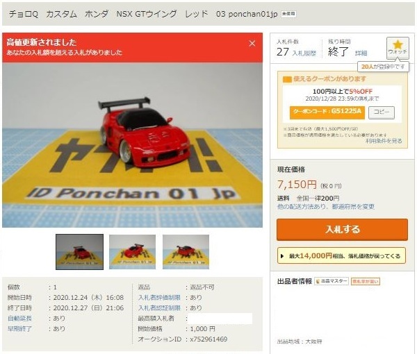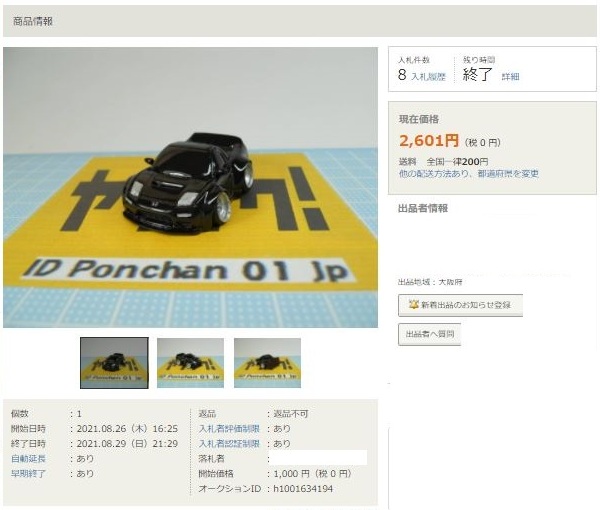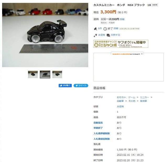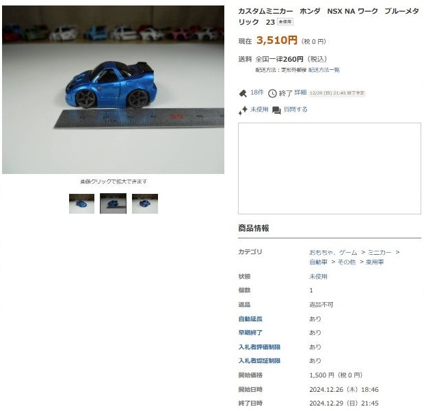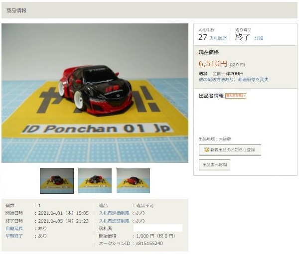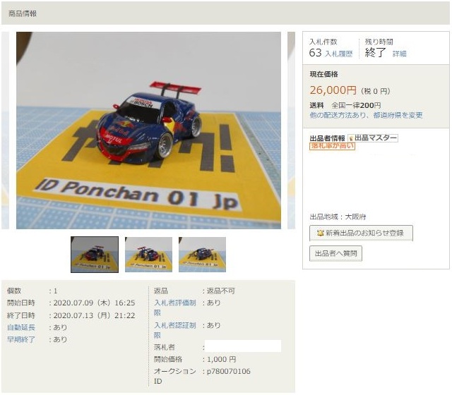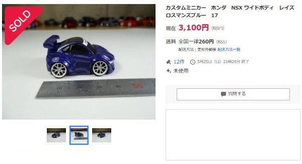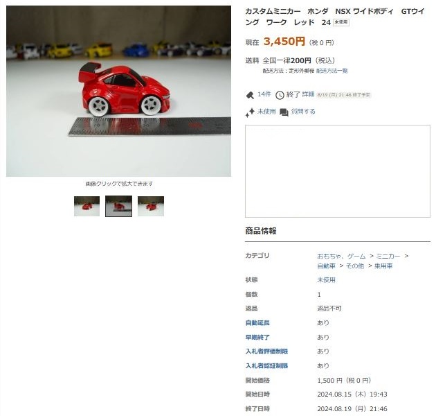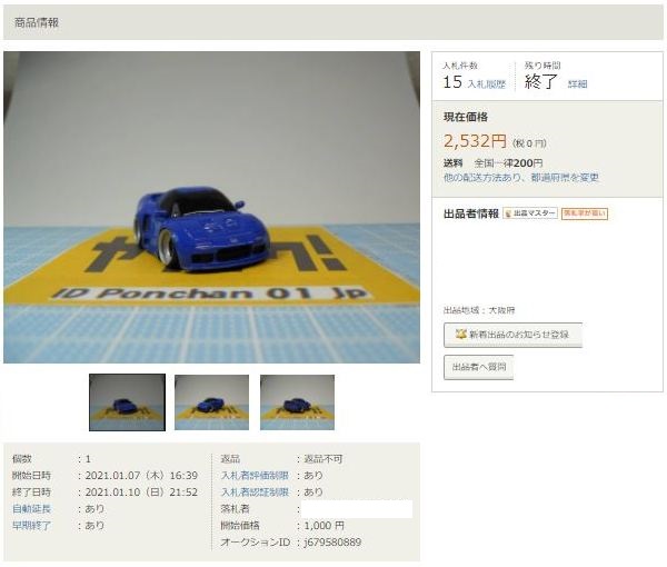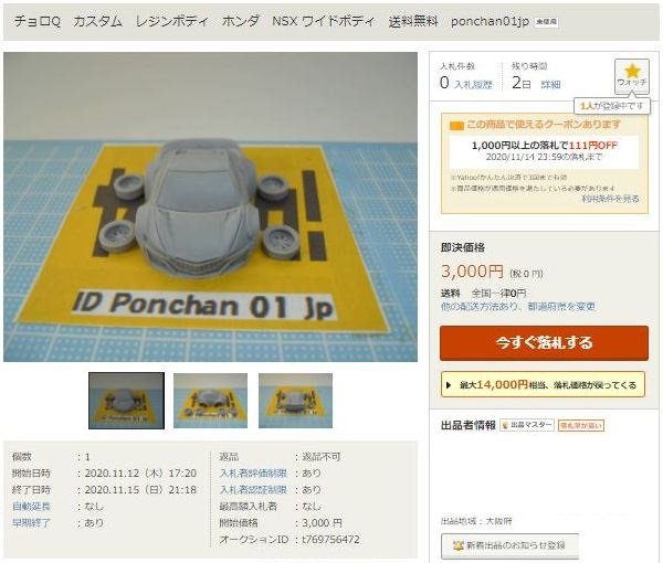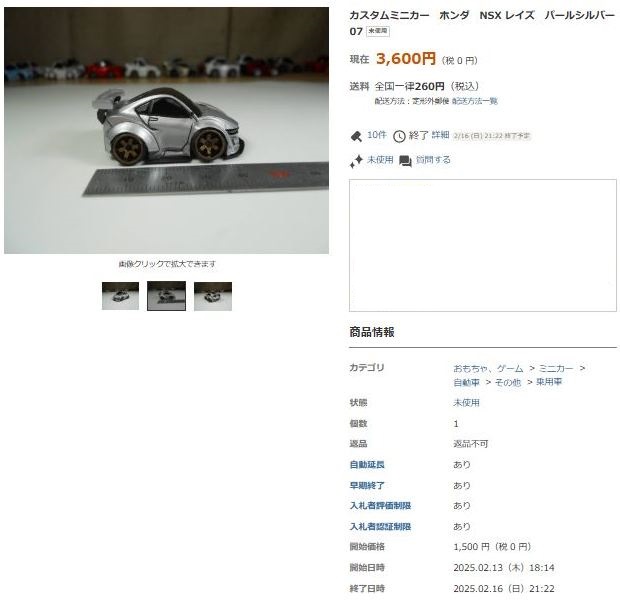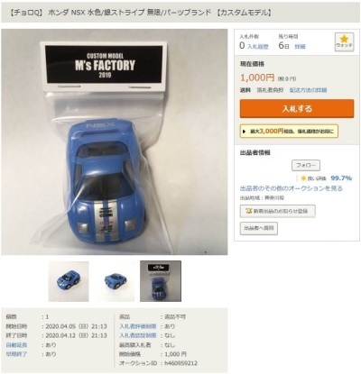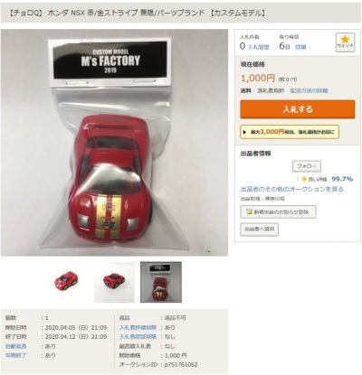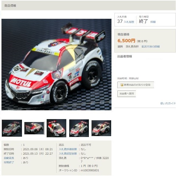 ▲2021年9月8日にヤフオクに初出品された「オリジナルチョロQ モチュール無限NSX-GT SUPER GT GT500 2017 No.16」。入札もしたが予想以上に高騰して脱落。