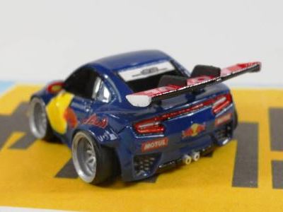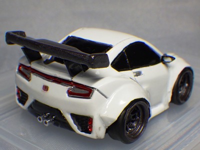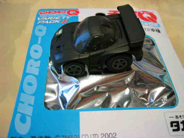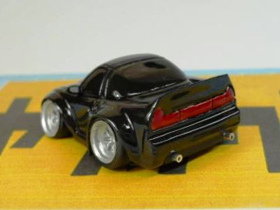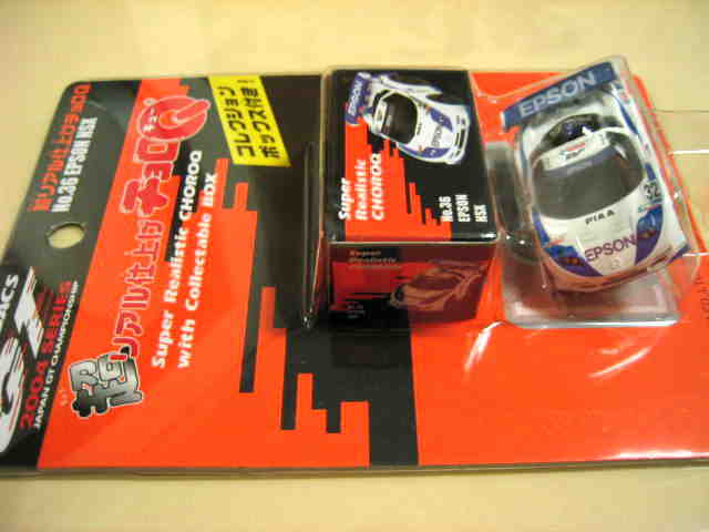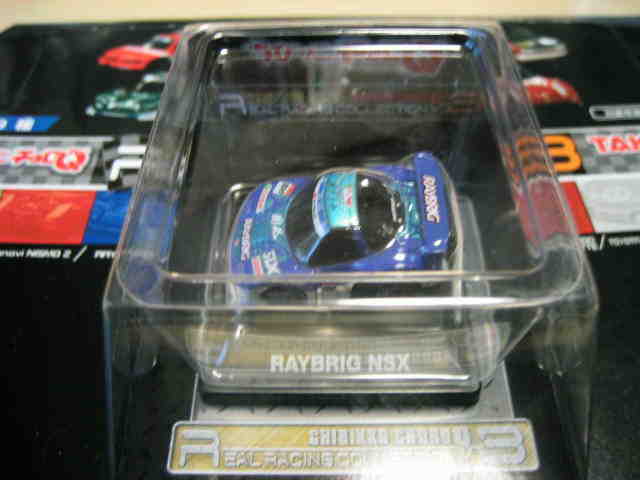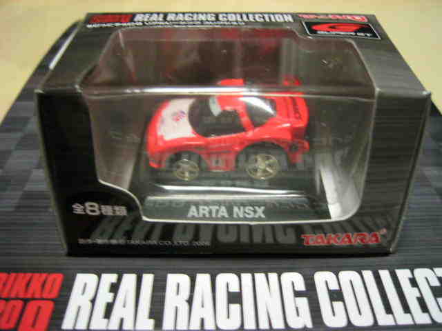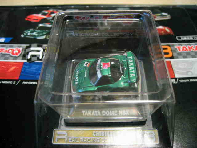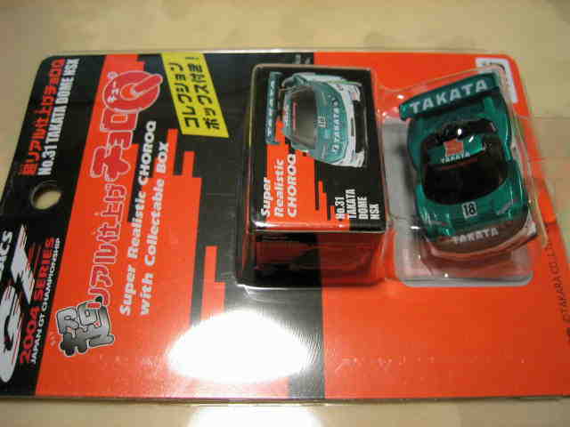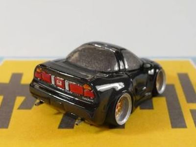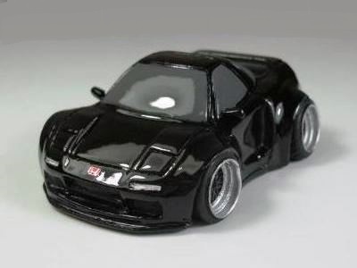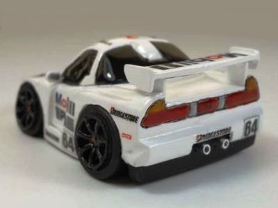 | 2002年12月28日発売。全12種の中に通常品のNSXレーシングの色替えモデル(黒)がラインナップされた。ブラインドパッケージ仕様の商品だが、薄いアルミ袋入りなので手触りでピンポイント購入が可能であった。車高の低さと、ごついリアウイングが見分けるポイント。 | |||