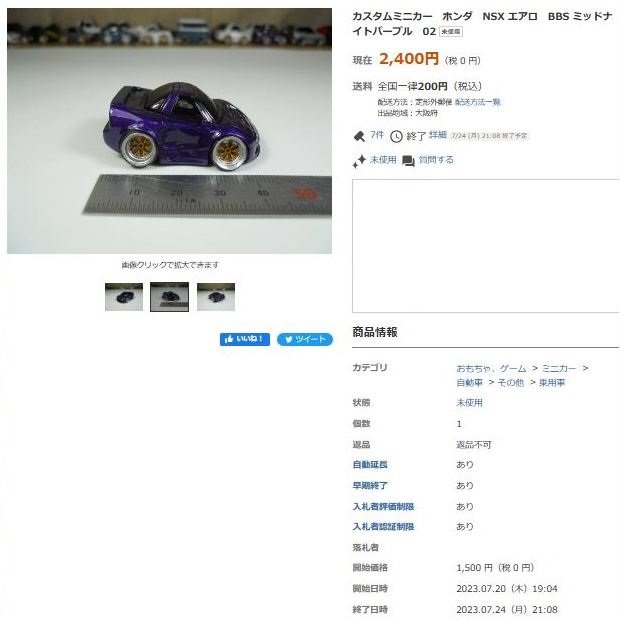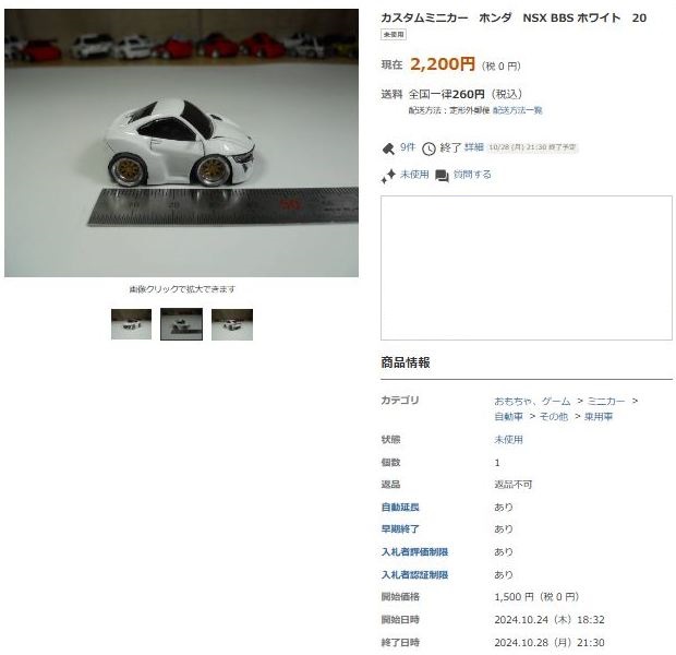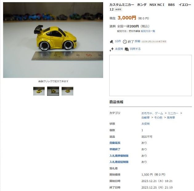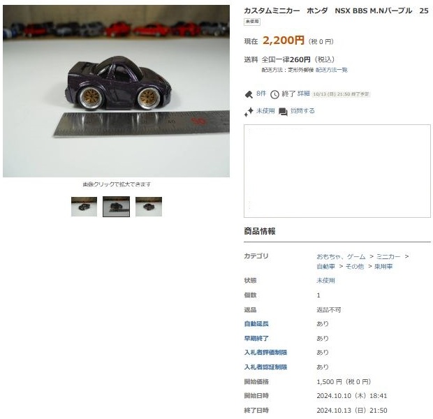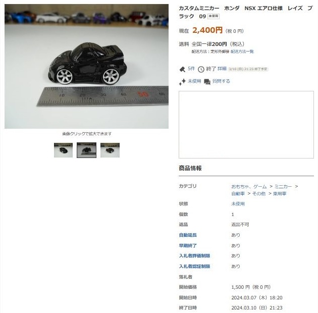 | ▲2023年10月26日出品のNA1トミカベースBBSブラック仕様(レジン製)。 | ▲2023年10月29日に2,500円で落札終了 |