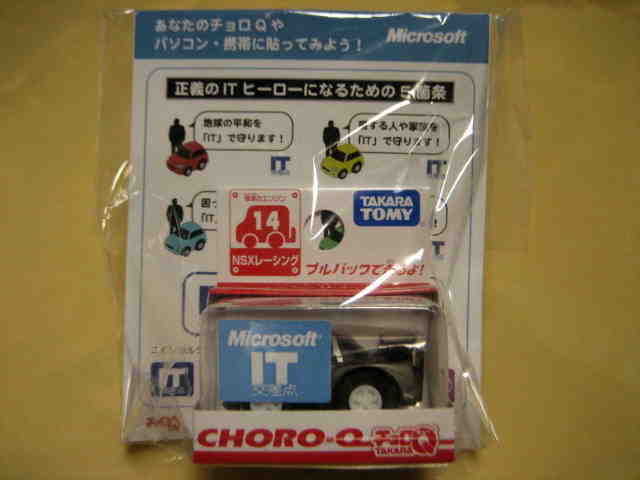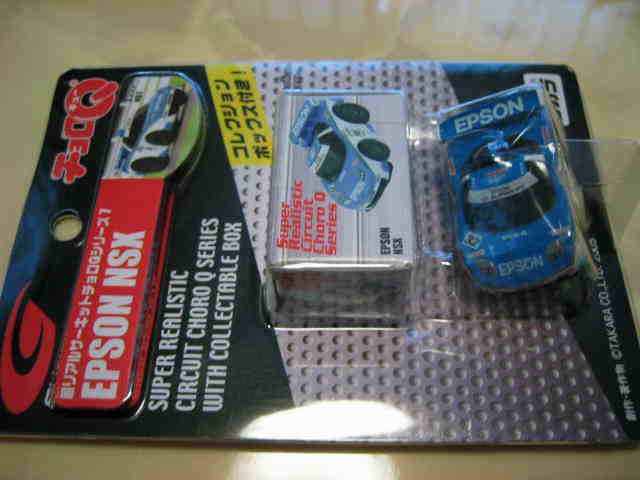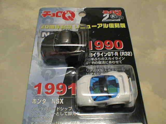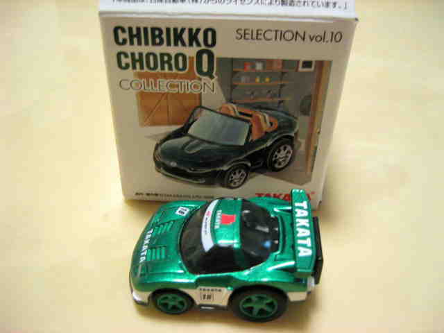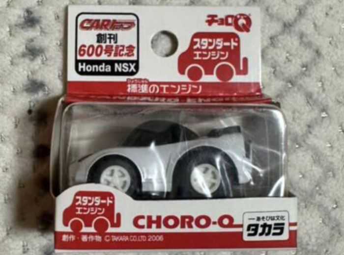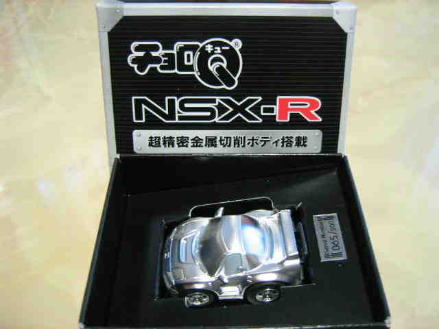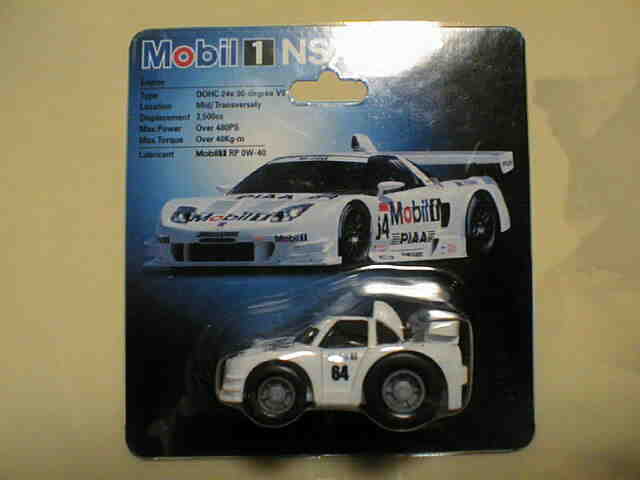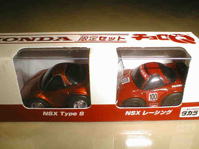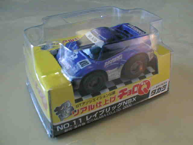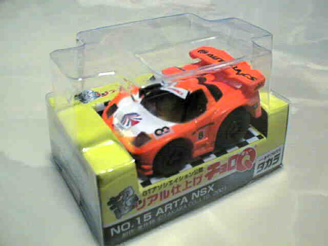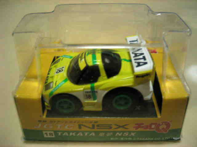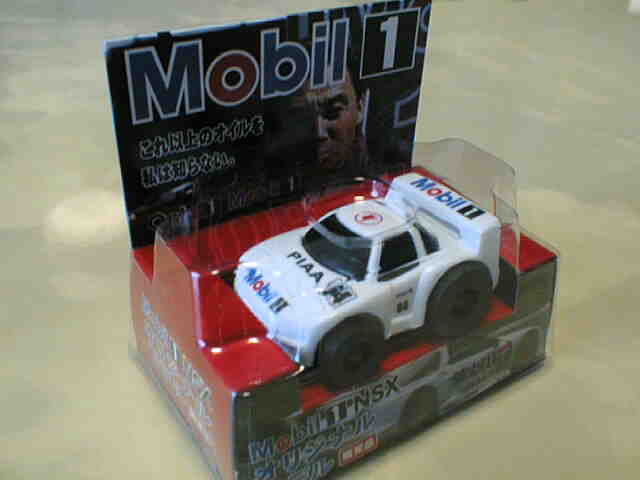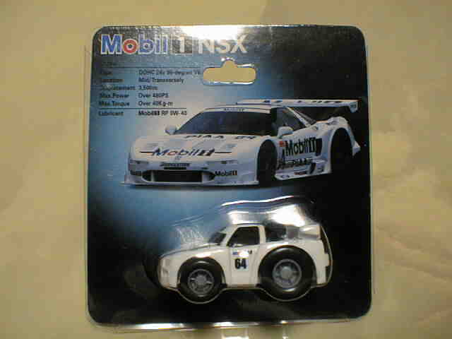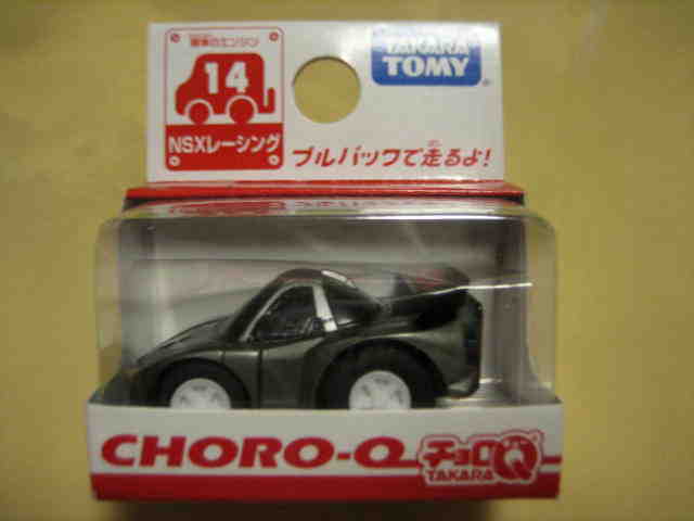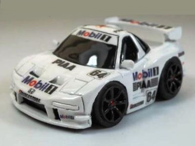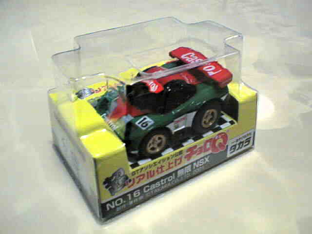 チョロQ(CHORO Q) ここではタカラのチョロQのNSXコレクションを紹介しています。2次加工モデルとしてはグッズ製作会社「プログレッサ」製作の物が多数存在します。みちのくプロレスの限定グッズとして試合会場で販売されたり、抽選賞品として配付されたりしていたようです。車種も多岐にわたり、NSXだけでも100種を超えているので(おそらく150種くらい)全車種合わせると軽く1,000種以上はあるのではないでしょうか。まさにコレクター泣かせのアイテムとなっています(タカラに無許可で2次加工品として販売したため裁判沙汰になったという話もありましたが、その後どうなったのでしょうか…)。 チョロQは、かなり後になって手を出したアイテムなので、「チョロQ大図鑑」(ネコパブリッシング・税込¥2,000)で勉強。VOL.1は1980〜86年までのモデルを完全網羅しているのですが、NSXは1990年以降の商品のため現行品をチラリと紹介しているだけ。VOL.2にはしっかり紹介されているので参考になります。 2001年8月、ヤフオクをにぎわした「モービル1NSXチョロQ」。以前特注モデルとして企画されながら発売されなかったモデルだけに、ヤフオク登場と同時に相場は2万円以上に高騰。しかし、8月のモービル1フェアのオイル交換時の景品であるこの商品は多くの人によって次々に出品され、数日後には早くも6,000円前後に値崩れ。1週間後には3,000円台に。プルバック機能はあるもののタカラ製チョロQではなく、裏面にタカラの刻印の代わりに中嶋レーシングのロゴの刻印のみ。ボディ、ホイールともに今まで発売されているどのNSXチョロQとも異なります。11月には1個100円で販売しているカーショップもあり、その後は100円でも買い手が付かない状態となりました。2002年5月にはパッケージをブリスターパックに変更し、中身もリニューアルして再びキャンペーン商品として配布されました。さらに秋には第3弾としてリアハッチエアインテーク付きの'02後期型にモデルチェンジ。10月1日〜11月30日の期間にオイル交換に5,000円以上かけたお客さんに配布されたスクラッチくじの商品でした。これらも安く入手可能です。 2002年6月22日、「全日本GT選手権2001シリーズセットラウンド2」(10,000円)が発売。セット内の10台の中で、NSXは前年に無限限定セットに入っていたロックタイト無限NSX1台のみ。これで両者がまったく同じ物だとつまらないのですが、一応微妙な違いがあります。以下参考までに。