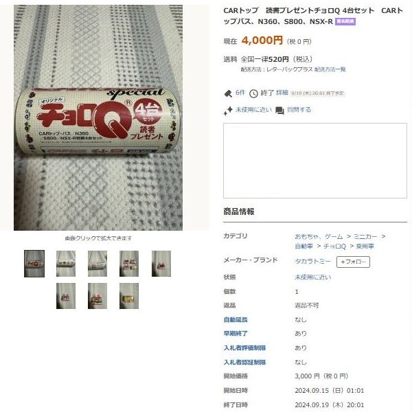 ▲2024年9月15日に、福岡からヤフオクに初登場した2007年製の「CARトップ創刊600号記念読者プレゼントオリジナルチョロQvol.1」。
