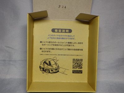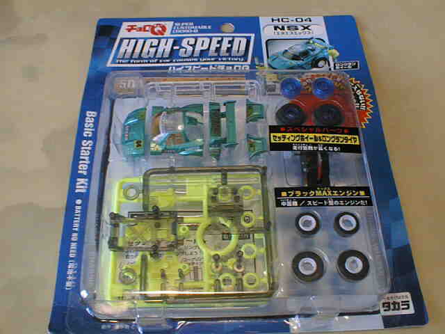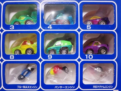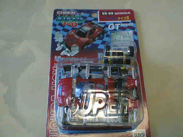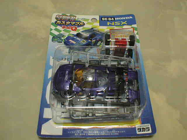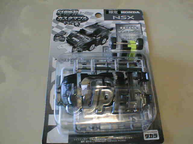 | 99年6月発売。キューブ、ロードスター、プレマシー、そして黄色のNSX。中国製。 | 1996年に登場した組立式 のカスタマブルシリーズが1998年にスーパーカスタマブルにバージョンアップ。パープルと同型だがGTの文字なし。地味な白黒パッケージ。中国製。 | ||
