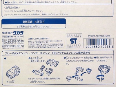| 2006年2月ヤフオクにて購入。出品者の方によると、高速道路のサービスエリアにて購入したとのこと。ビュンビュンカーのステッカー違い。裏板に「2806-12 MADE IN CHINA」の刻印。 | |||