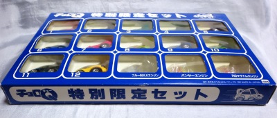 2019年5月4日にヤフオクに出品されたものを初めて見つけて5月12日に落札した、NSXを2台含んだチョロQの15台セット。1997年発売の日本製。 それまでヤフオク以外でも全く見たことのない商品だったが、「NSX」というキーワードなしで出品された商品は、私の普段のヤフオク検索に引っかからないので、過去にも出品されたことがあったかもしれ ない。 2000年にNEKO MOOKから発行された「チョロQ大図鑑Vol.2」106ページの15台セットコーナーに、似たようなパッケージデザインの「15台特別限定パック」(1995年発売)という商品が掲載されているが、明らかに別物。 ネットで調べても、この「特別限定セット」の情報は少なく、何とか見つけた数枚の画像をよく見ると、9〜12の位置の中身の車種には数種類のパターンがあるようだ。 パターン@9.NSX(ブルーグリーン)、10.300ZX(クリアブルー)、11.オデッセイ(クリアブルー)、12.RX-7(イエロー) パターンA9.パジェロ(グリーン)、10.ロードスター(パープル)、11.300ZX(トリコロール)、12.スープラ(クリアオレンジ) パターンB9.セリカGT-FOUR?(クリアオレンジ)、10.TS010?(イエロー)、11.スープラ?(ゴールド)、12.セリカGT-FOUR?(グリーン) パターン@が今回の商品で、このパターンは他に画像が見つからないのだが、出品者の方によれば、新品で購入後、中身の位置は変えていないと言われていたので、この組み合わせはオフィシャルな1つのパターンとみて間違いなさそうだ。 パターンAも1枚しか画像が見つからないのだが、このセットの所有者の方が、ご自分のHPに中身の1台ずつの画像を掲載しているので、このパターンも実在していた模様。 パターンBは2枚の画像が発見されたので、実在していた模様。9.以外の車種は多分上記のもので合っていると思うが詳細は不明。 パターンCとして示した画像は、明らかにオフィシャルな配置ではなさそうだ。 ちなみに、確認したわけではないが、前述の「15台特別限定パック」も含め、このセットの中身はすべて通常品のようで、このセットのみの限定バージョンなどは含まれていないようである。 |