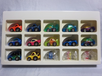 2019年5月にヤフオクで入手した、1997年発売のNSXを2台含んだチョロQの15台セットであるが、このときにネットで色々調べた結果、内容の組み合わせが入手品の他に2パターン存在することが判明。 そのうちの1つが2020年1月1日にヤフオクに出品され、落札に成功した。 内容はパターン@の説明欄に記載したとおりで、NSXは5の場所に収まるバイオレットクリアの1種のみである。 |