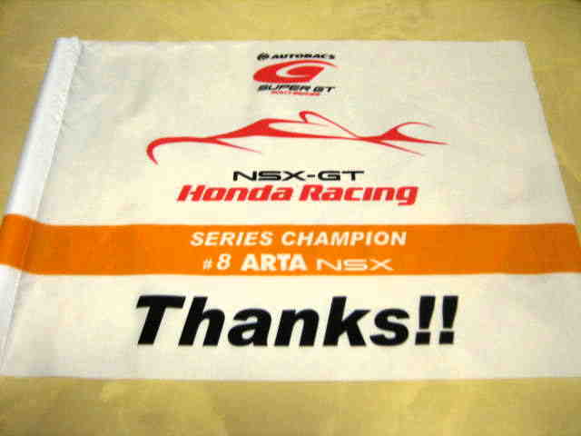 | 2007月10月14日のGT第8戦で念願のドライバーズタイトルを獲得したATRAが記念に製作し、11月3〜4日に富士で開催された最終戦で配付した物。フラッグのサイズは30×41cm。 | 2008年3月ヤフオクにて購入。 2008年のスーパーGT開幕戦においてホンダファンのためのファンシート特典として、キャップやリストバンドなどとともに用意されたグッズの1つ。 |