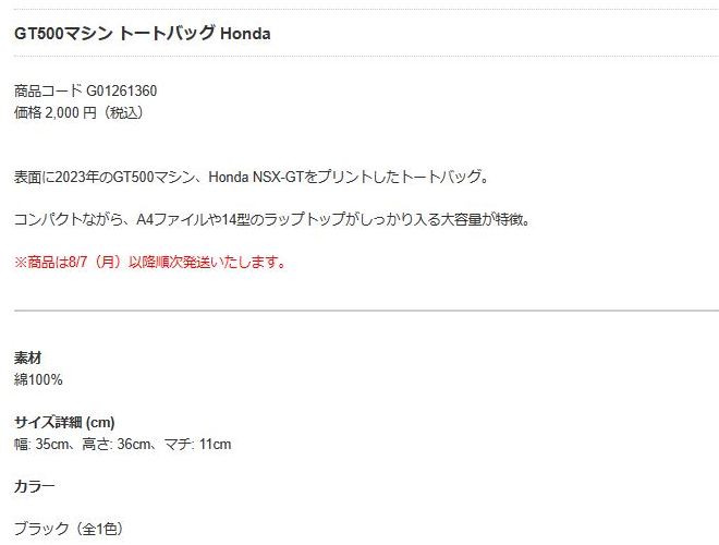 2023年8月3日11時よりスーパーGTスクエアで販売開始。 その日に「GT500マシン Tシャツ Honda」、「GT500マシン クリアファイル Honda」、「GT500マシン マフラータオル Honda」と一緒に注文。 8月7日に発送され、8月9日に届いた。 |