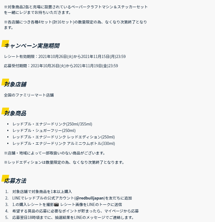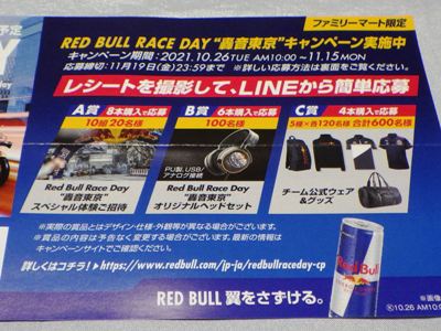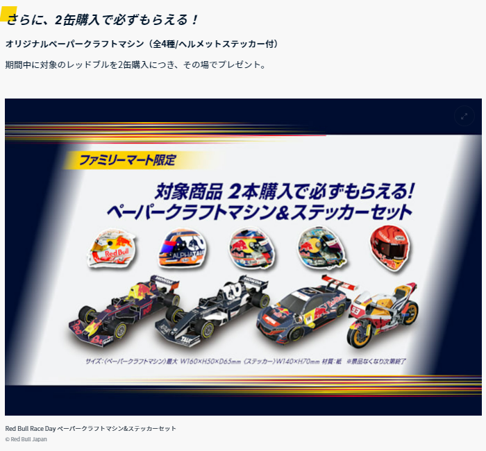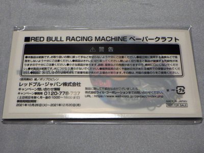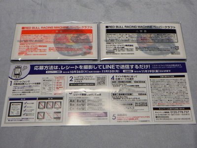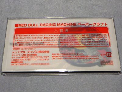 2021年10月にいつもお世話になっている福岡のW氏からレッドブルキャペーンの貴重な情報をいただいた。 ファミリーマートでレッドブル商品を2本購入するごとに、レッドブルレースマシンのペーパークラフトがもらえるというキャンペーンが10月26日から始まったというもの。 各店舗につき4車種16セットしか置いていないため、NSXは4セットのみしかなく、しかもNSXだけはドライバーシールが2種存在するため、1種につき2セットずつしか置いていないということになる。 私は10月28日の朝にレッドブルを4本購入し2種とも入手することができた。 後日開封用に別の店舗でさらに1セット入手。 |