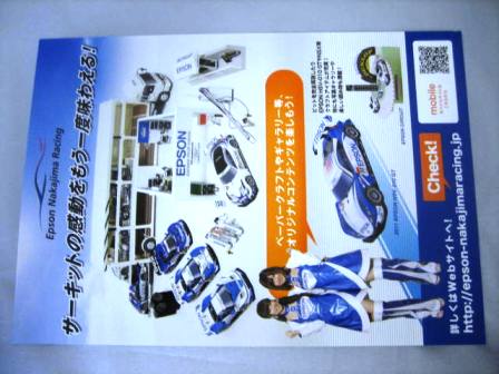 | 2011年7月コレクター仲間より譲っていただく。エプソンのサイトからダウンロードしたものではなく、サーキットでステッカーと共に配布されていたもの。 前年同様、A4サイズの厚紙に印刷されており、切れ目も入っていて、のりを使わずに簡単に組み立てられるタイプ。 | 2011年7月コレクター仲間より譲っていただく。サーキットでステッカーやペーパークラフトと共に配布されていたもの。「ペーパークラフトやギャラリーなど、オリジナルコンテンツを楽しもう!」というキャッチフレーズでエプソン中嶋レーシングのサイトを宣伝するチラシ。A5サイズ。 | ||