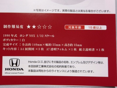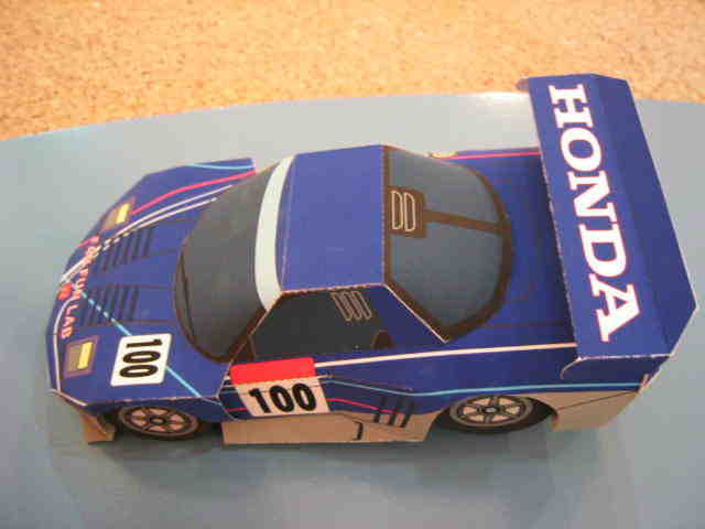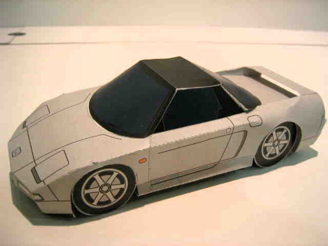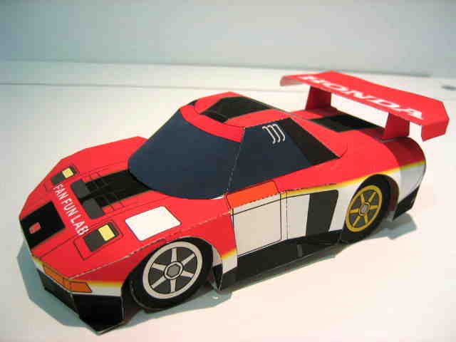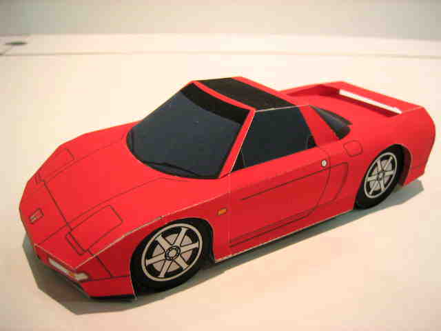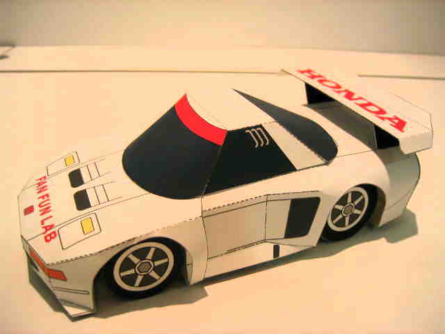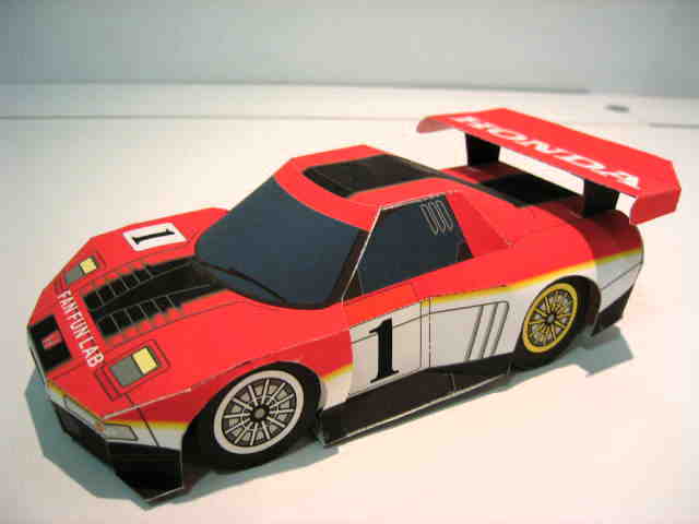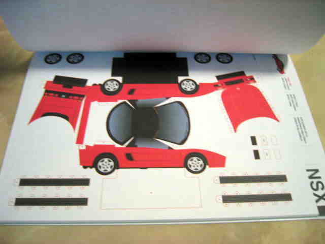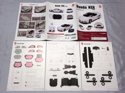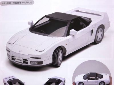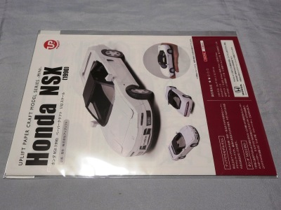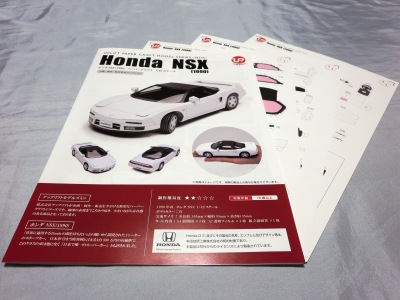 | 2004年8月ヤフオクにて入手。完成写真、組立説明書含め5枚組で、ステッカー2種4枚とともに紙ケースに収められ、ピットウォークなどで配布されたらしい。 | 2003年4月に学研から出版されたペーパークラフト集で定価は2,000円(税別)。新旧のホンダ車20台を収録しており、P13がNSXとなっている。1枚のみのシンプルな構造。 | ||