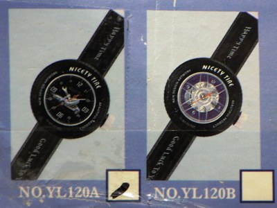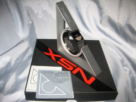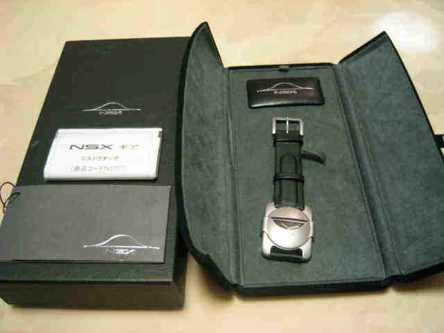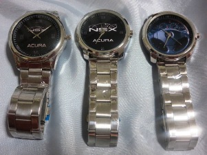 最後発の右のNSX-Rステアリングタイプは2本のみの出品落札で、ダイアル部分はいかにも写真を貼りましたという感じで安っぽい。先の2種についても、あたかもアキュラ純正かのような説明で出品されているものあるが、様々な車メーカーのロゴやイラストをデザインした時計が同時に多数出品されているので玩具の時計と割り切った方がよい(普通に考えて1,000円以下の商品)。ちなみに全て同形に見えるが、イラスト小タイプのみケースとリュウズの形状が他と異なる。 その後もベース機種が微妙に変化した物の出品が続いたがキリがないので入札せず。2018年11月現在でも出品がある。 |