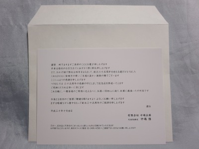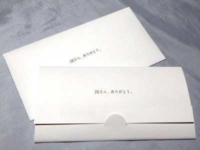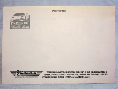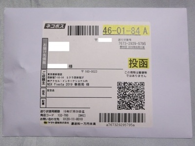 NSX購入のため、足繁くNSX専門店のルートKSさんに通っているN君が、2019年4月に、お土産にオリジナルキーホルダーとオリジナルステッカーをもらってきてくれたのだが、それらが入れられていた封筒。 サイズは12.0×23.5cmで、長形3号と呼ばれる定形郵便物としては最大サイズの封筒。 以前N君と一緒に訪問したときにNSXグッズをコレクションしていることをアピールしたことを覚えていてくれた受付のお姉さんがお土産を用意してくださったのだが、お姉さんとN君に感謝。 |