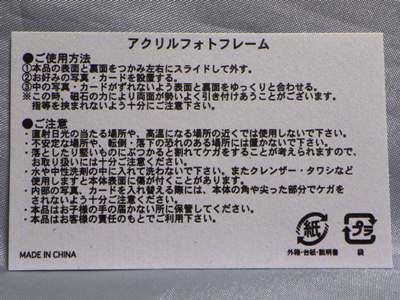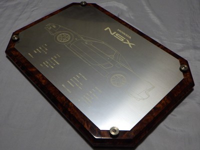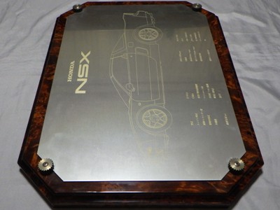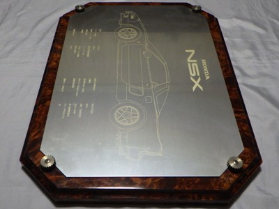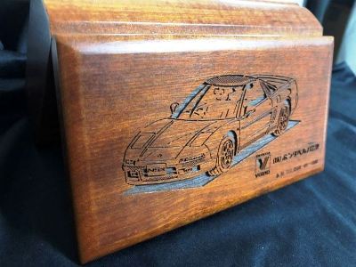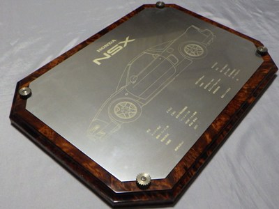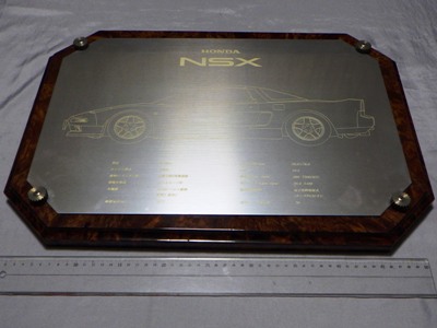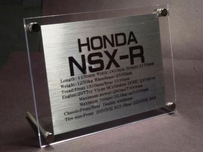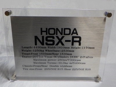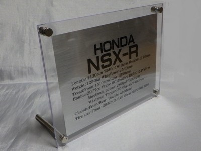2024年8月22日ヤフオク初登場。 東京の個人の方によるオリジナルアクリルスタンド。 デザインは3種(NSX-R・NSXタイプS・NSXタイプR)、サイズも3種(大型…外形約190mm×140mm/カード部約155mm×135mm・中型…外形約150mm×110mm/カード部約120mm×80mm・小型…外形約110mm×80mm/カード部約90mm×60mm)あり、計9タイプとなっているが、私はお試しで「NSX-R」の「大型」タイプをセレクト。 アクリルは高純度・高透明のキャストタイプ(流し込み製法)で、1.5mm+1.5mmの高級アクリル硬質板を用い、金具も専用のネジ留式特注金具を使用しているとのこと。 デアゴスティーニやアシェットのミニカーと一緒に並べることを想定した商品なのだが、スペックデータは従来の台座に使用されているものを流用しているとのこと。 カードはシルバーのライン入り高級紙を使用しているとのことだが、確かにぱっと見はアルミ製に見える高級感がある。 |