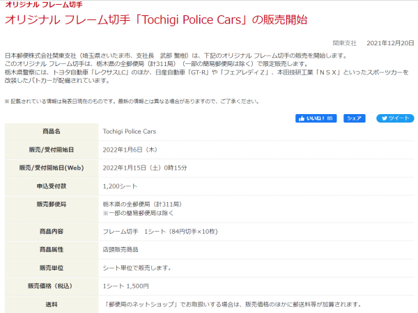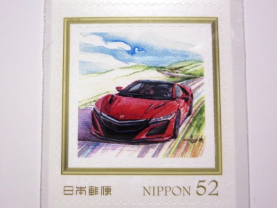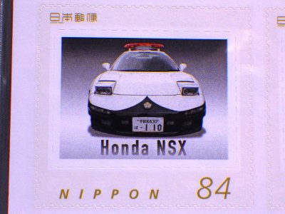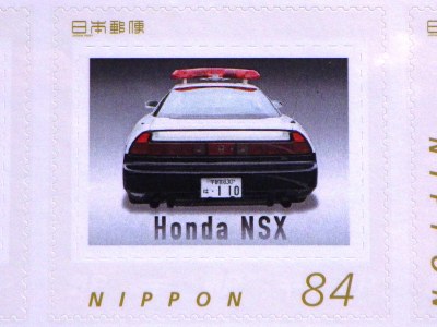 2021年12月20日に日本郵便関東支社がオリジナルフレーム切手「Tochigi Police Cars」の販売を発表した。 栃木県警察に配備されているNSXを含むパトカーをモチーフにした商品。 栃木県警察には、NSXのほか、レクサスLC、GT-R、フェアレディZといったスポーツカーを改装したパトカーが配備されている。栃木県全ての郵便局(計311局・一部の簡易郵便局は除く)での1,200シート(1シート・84円切手×10枚)の限定販売で、2022年1月6日に発売。 ネットでも2022年1月15日の0時15分から販売が開始されたのだが購入できなかった。 ヤフオクには2022年1月14日に初登場したが、1月16日に定価の4倍まで高騰したため落札を断念し、1月19日に定価の2倍程度まで下がった別の出品物を落札した。 |