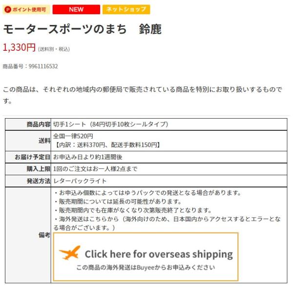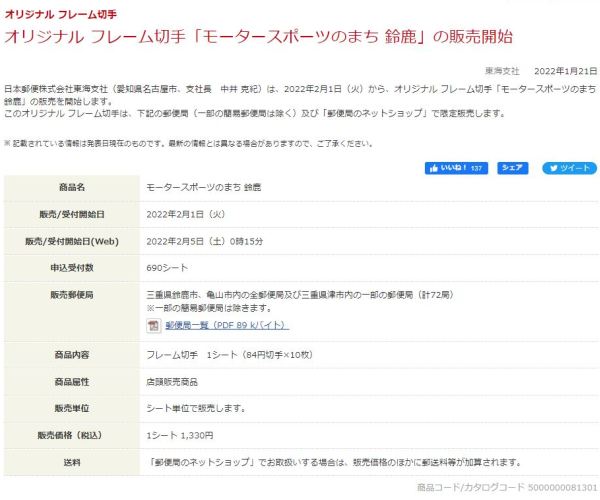 2022年1月に発売されたオリジナルフレーム切手「Tochigi Police Cars」(栃木県1,200シート限定・2022年1月6日発売・1月15日0時15分ネット発売)に続き、三重県にて690シート限定でオリジナルフレーム切手「モータースポーツのまち鈴鹿」が2022年2月1日に発売になった。 定価は1,330円。 2月5日0時15分からネット販売されることも事前に情報を得ていたが油断して買いそびれてしまい、なんとかヤフオクで見つけて無事落札した。 Astemo REAL RACINGのAstemo NSX-GTの切手が含まれている。 |