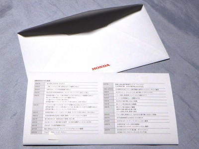 | 「ディーラーからのNC1購入礼状」「ホンダR&DアメリカからのNC1購入礼状」「インテリジェント・ウェブへの案内状」「任意保険手続きのお願い」/ホンダ | |