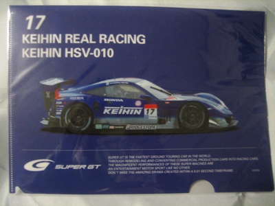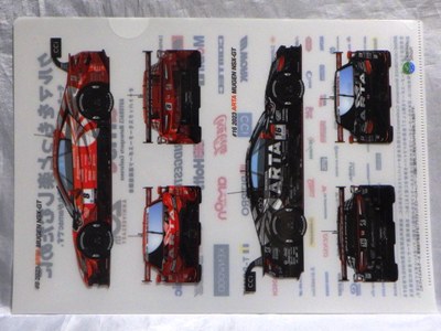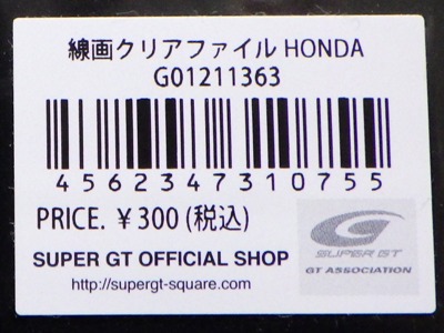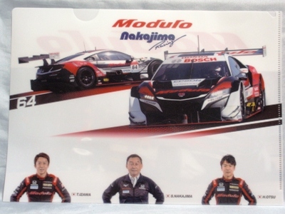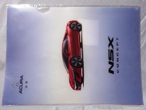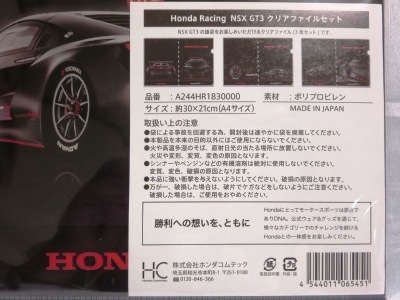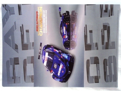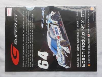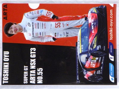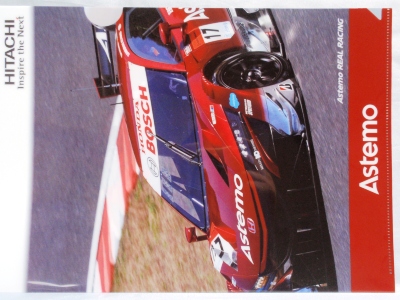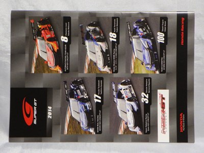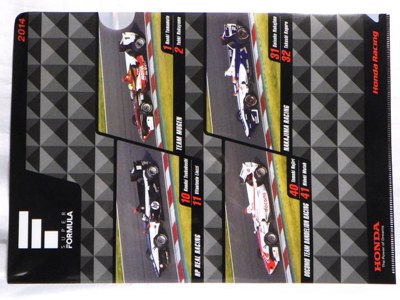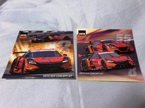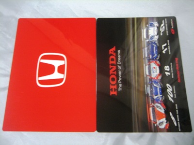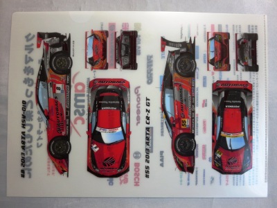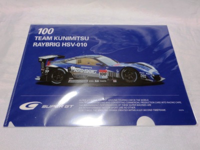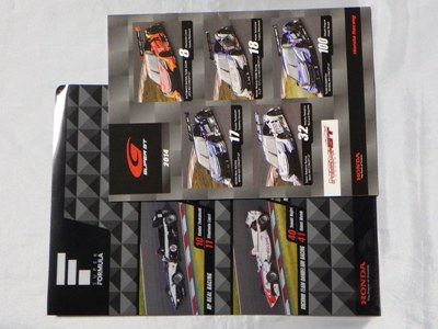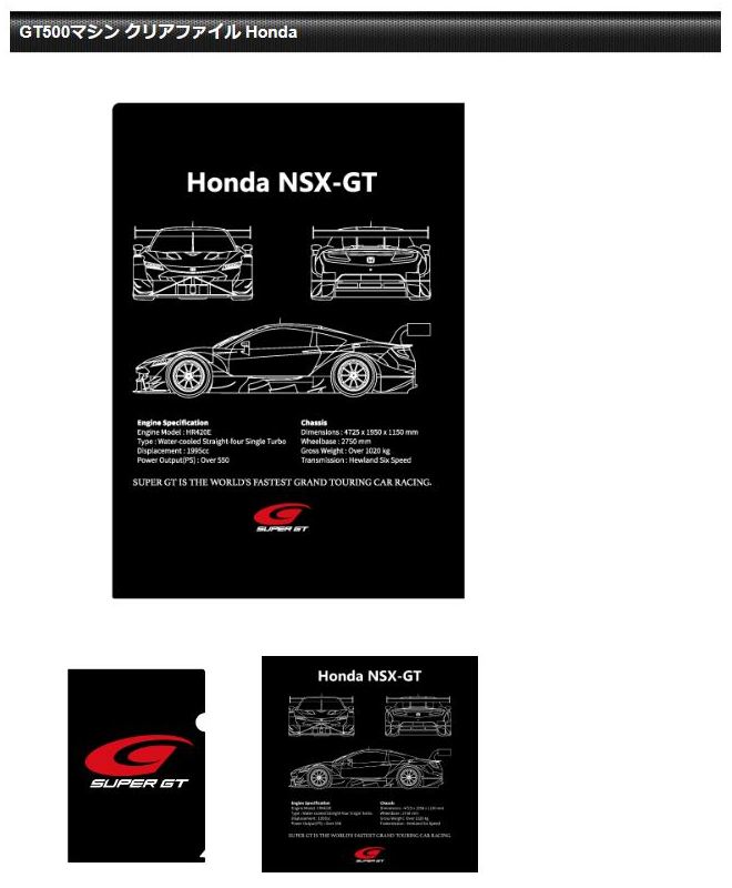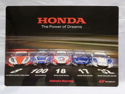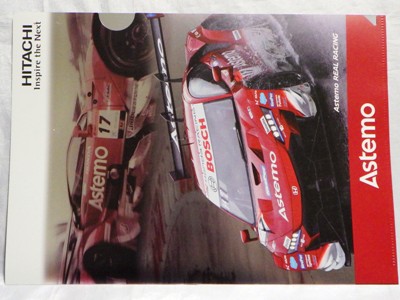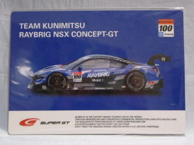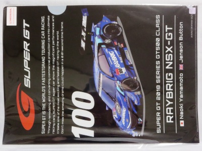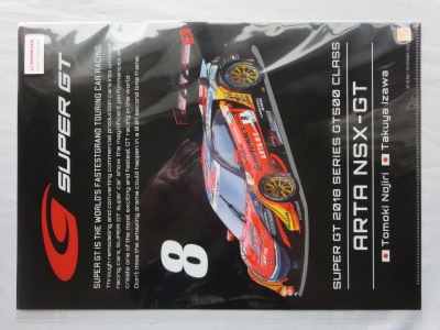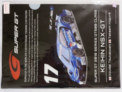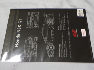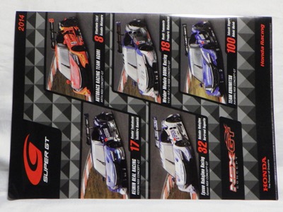 2017年8月ヤフオクにて入手。 片面にスーパーGT2014参戦マシンであるNSX-GTコンセプト5台、もう片面にスーパーフォミュラ参戦マシン4台がデザインされている。 おそらくサーキット等での配布物。 画像は2020年7月に再入手したときのもの。 ほぼ同デザインのクリアファイルも、2017年、2020年の両入手時に、同時に入手。 |