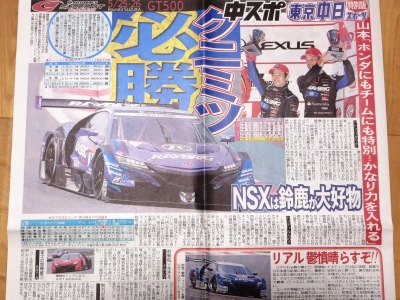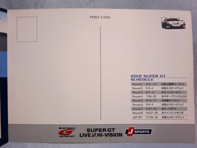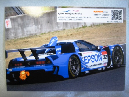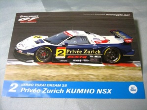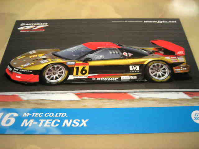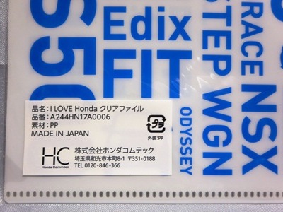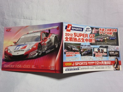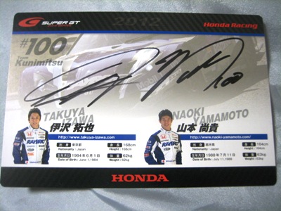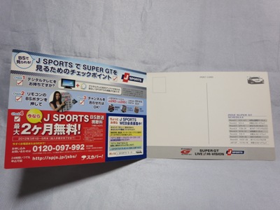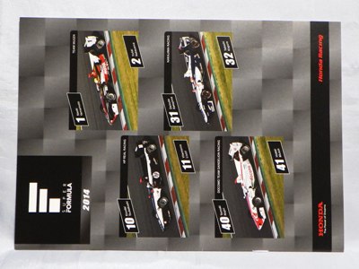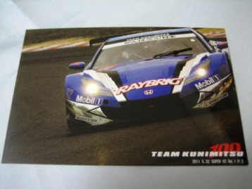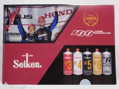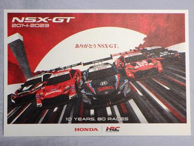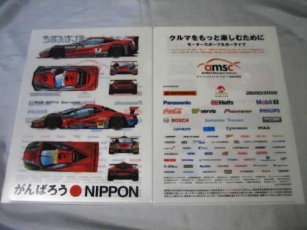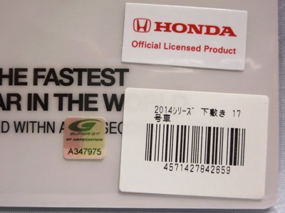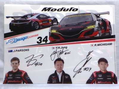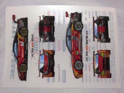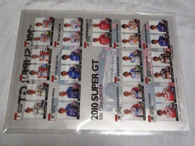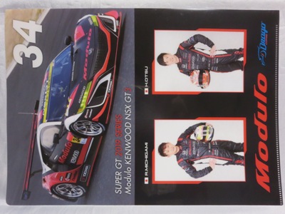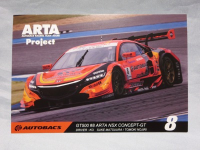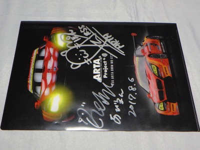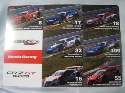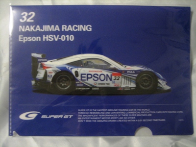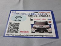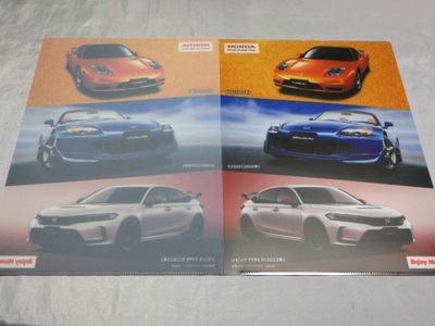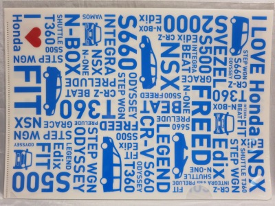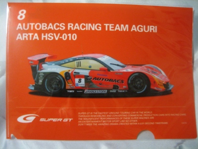 2017年8月ヤフオクにて入手。 片面にスーパーGT2014参戦マシンであるNSX-GTコンセプト5台、もう片面にスーパーフォミュラ参戦マシン4台がデザインされている。 おそらくサーキット等での配布物。 画像は2020年7月に再入手したときのもの。 ほぼ同デザインのクリアファイルも、2017年、2020年の両入手時に、同時に入手。 |