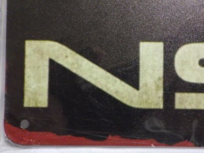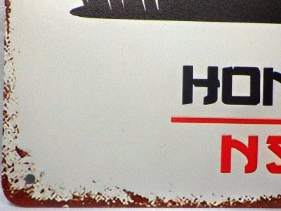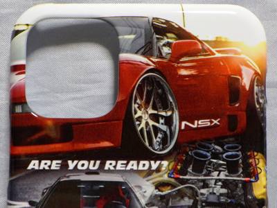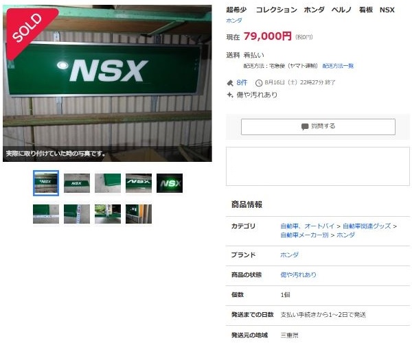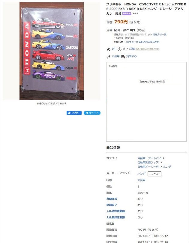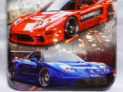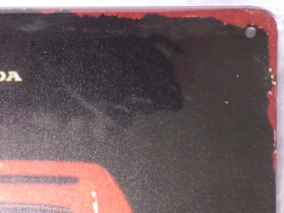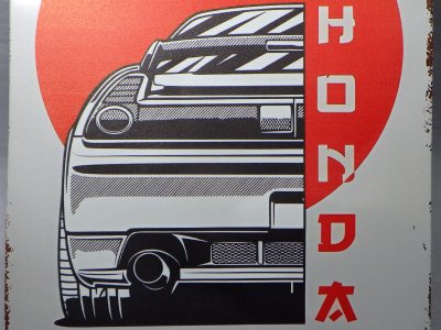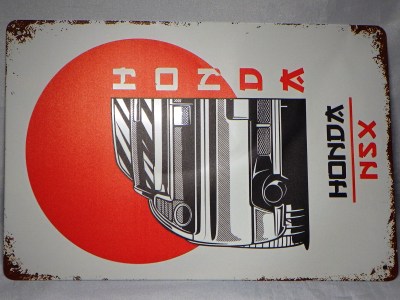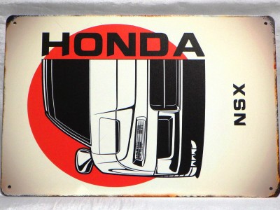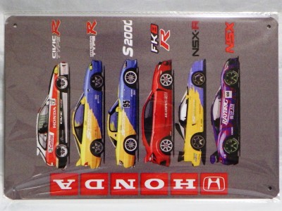 2023年9月13日にヤフオクに神奈川から開始価格790円で初出品された海外製と思われるブリキ看板を落札し損ね後悔していたのだが、2024年7月27日、同じ商品が福島からヤフーフリマに2,300円で出品されているのを発見。高いと思いつつも割り切って購入しようとしたら、その3日前に神奈川からヤフオクに同商品が再出品されているのを発見。前回より値上げされ990円だったが、即決価格の1,200円で迷わず落札。NSXを2台を含むレーシーなホンダ車が6台並んだカッコイイ構図なのだが画質が非常に粗いのが残念。S2000のロゴは端の方が変形してしまっておりクオリティは低い。東京のU氏が出品されている商品のようなエイジング(塗装による経年劣化)処理はされていない。サイズは30×20cm。 |