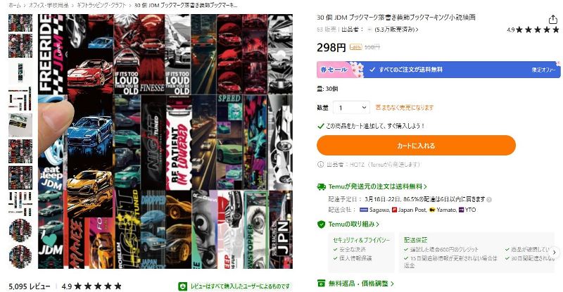 2024年3月に「Temu(テム/ティーム)」で購入。 正式な商品名は「30個 JDM ブックマーク落書き装飾ブックマーキング小説絵画」。 「ブックマーク」つまり「栞(しおり)」である。 「JDM」は「Japanese domestic market」つまり「日本市場」のこと だが、海外で日本のパーツメーカーのパーツを用いて車をカスタムするジャンルの名称として定着している。 栞は紙製なので当然安価。 画像では46%OFFの298円だが購入時は239円だった。 1枚あたりのサイズは15×4cmで30枚すべて同じ。 そのセットの中にNSXのデザインが1枚だけ含まれているのを見つけて購入した。 |