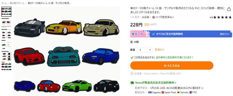 2024年3月に「Temu(テム/ティーム)」で購入。 NSXグッズとしては初めてとなるサンダル用アクセサリー。 一般的にはチャームと呼ばれており、サンダルの有名ブランド「クロックス」の公式チャームには「ジビッツ チャーム」という名称がある。 ちなみに、クロックスは2002年にできたアメリカの企業で、ジビッツは2006年にクロックスが買収したアクセサリーメーカー。 もちろん今回の商品はノーブランド。 10個から40個まで様々な数の詰め合わせ商品があるが、NSXを含む一番少ない10個セットを購入。 定価437円のところ3月17日現在の価格は-47%OFFの228円 だが、購入時はもう少し安く217円だった。 |
