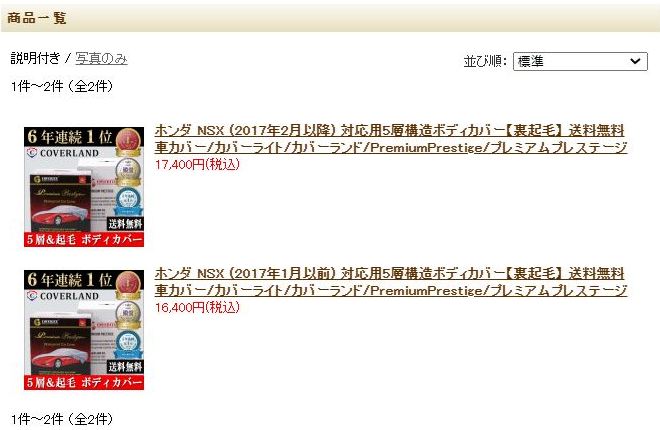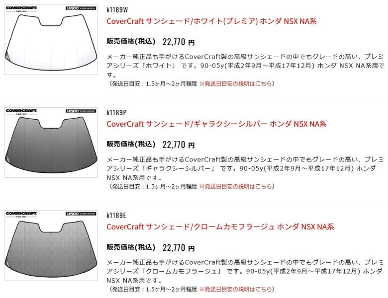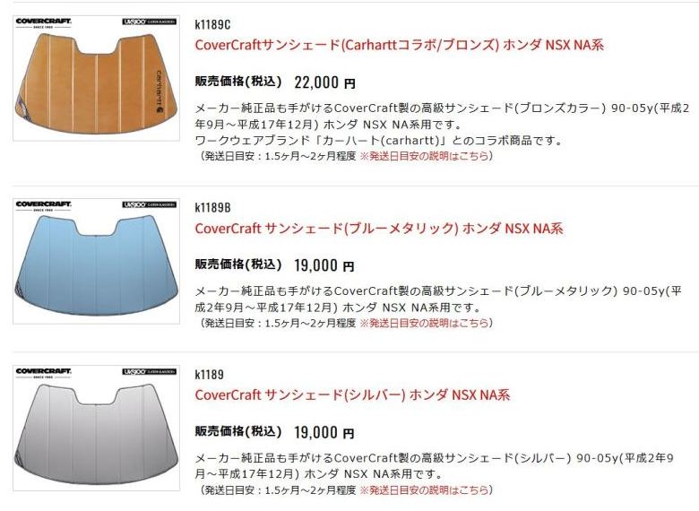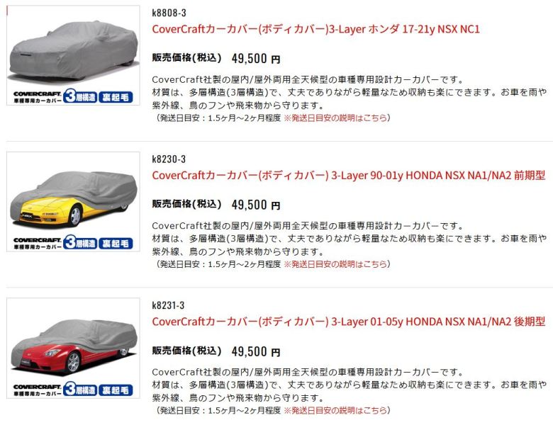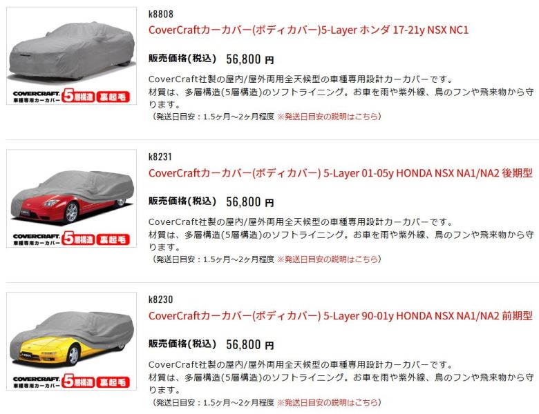 ションとしてOEM供給も行っている。NSX用の定価は19,000〜22,770円(税込)。カーカバーはNA1/NA2/NC1のすべてのタイプに3層構造のスタンダード版と5層構